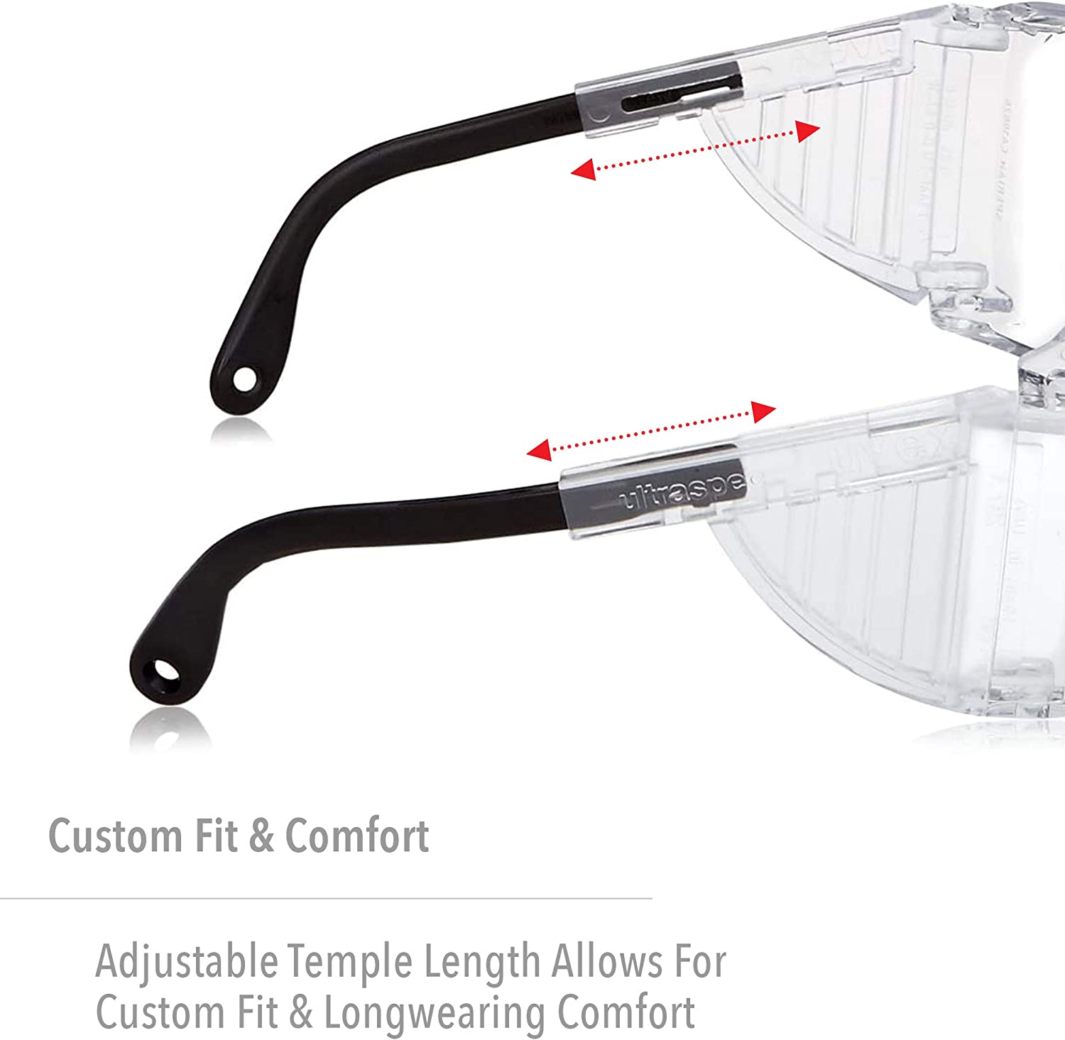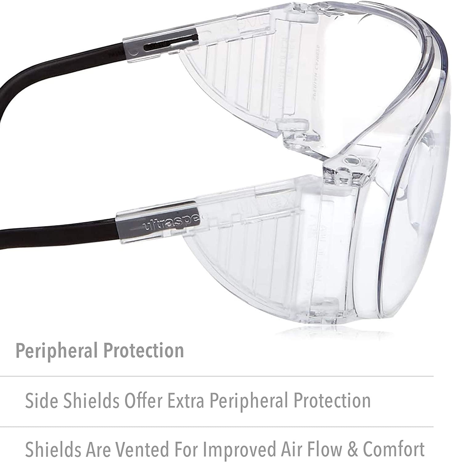 • SAFETY and COMFORT: Wraparound uni-lens design and built-in side shields protect against flying debris, splashes, airborne droplets etc.; side shields feature venting for better airflow and comfort; adjustable temple length ensures comfortable, custom fit