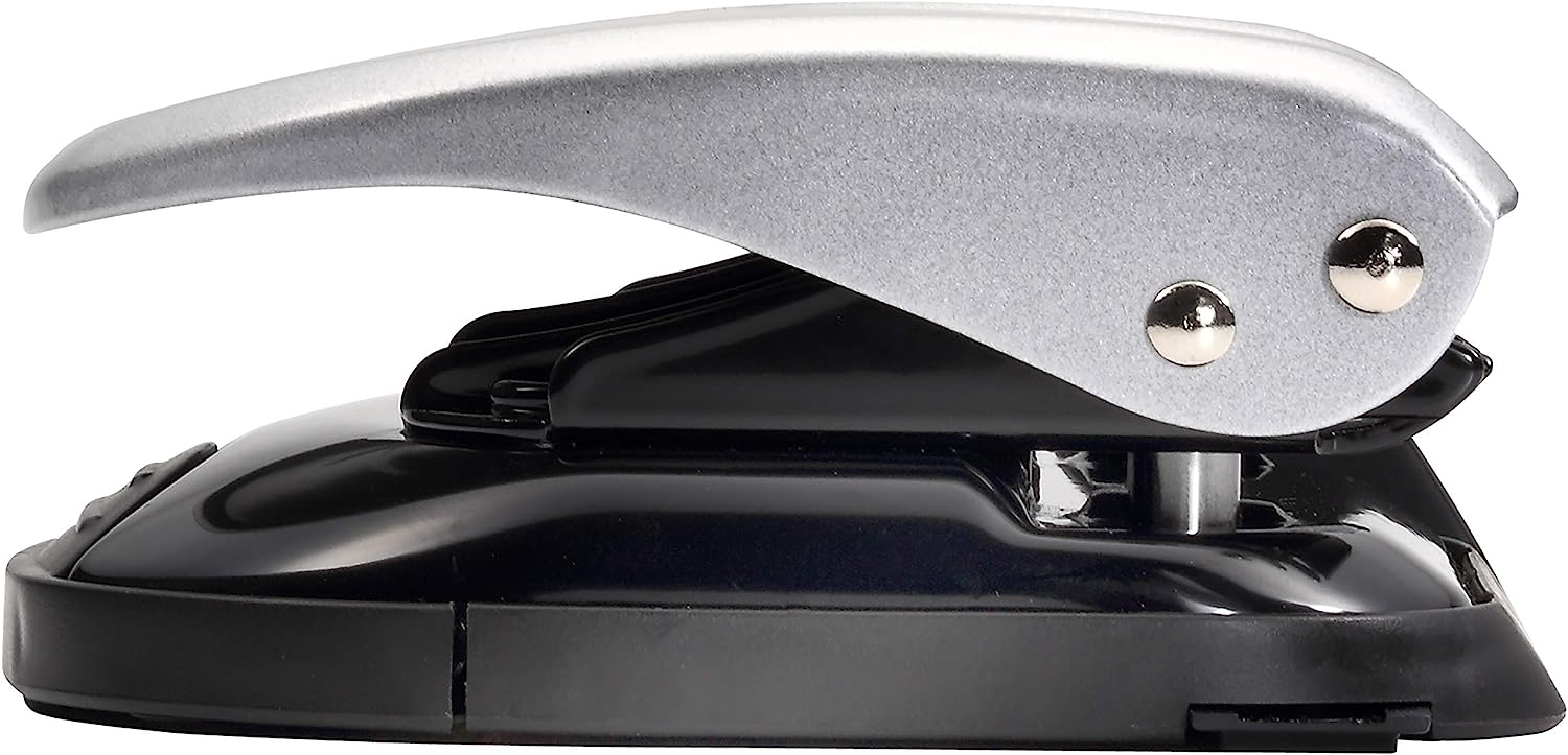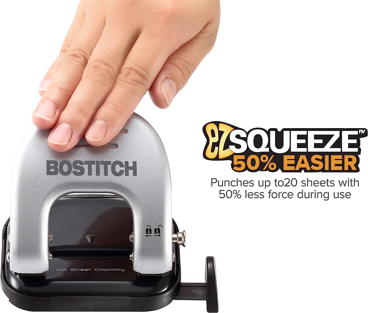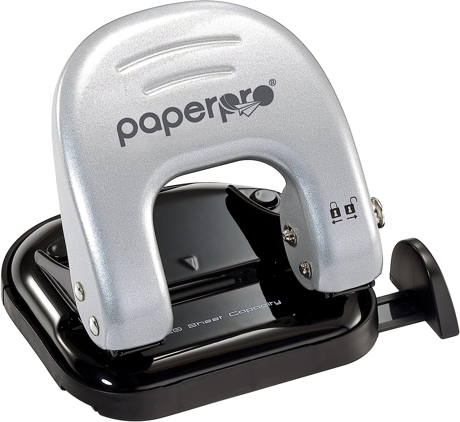 With this Bostitch two-hole punch built with PaperPro technology, easily punch up to 20 sheets, jam-free. Designed with sleek, comfortable curves and a durable all-metal design for long-lasting performance. To ensure consistent hole placement, the punch has an integrated paper guide and ruler. For maintaining a clean work environment, the base holds the chip waste and can be emptied through the flip-open door. Ideal for the home, office or school, this hole puncher is the perfect tool for any setting.