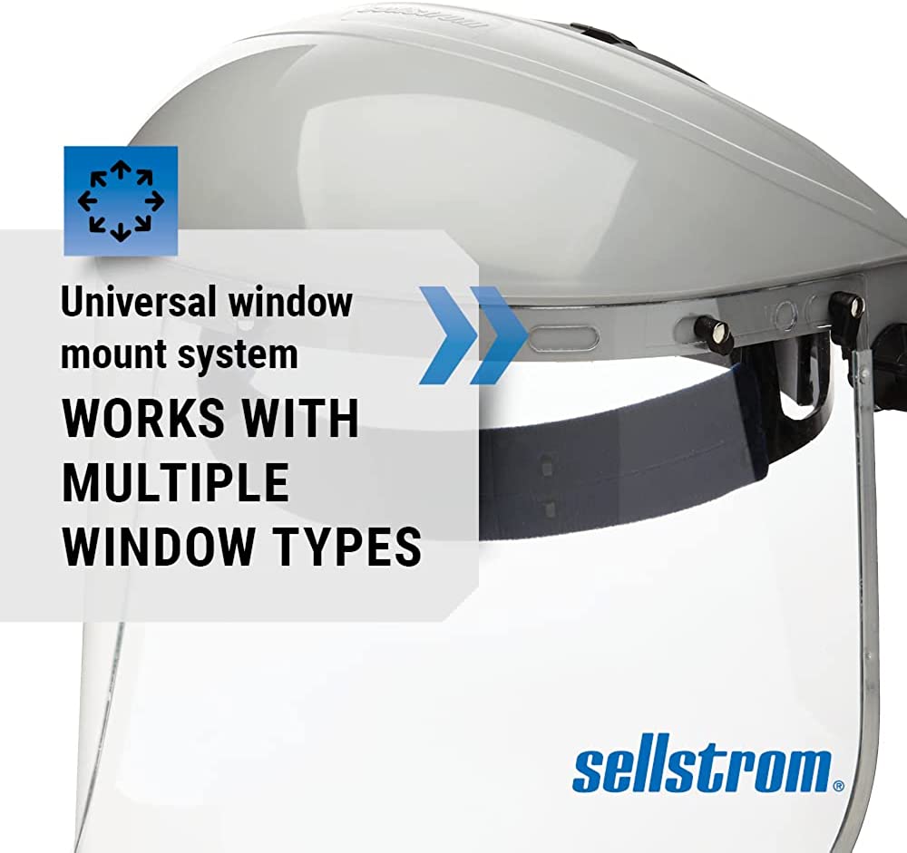FACE SHIELD FEATURES: Includes a grey abs crown, uncoated clear polycarbonate window with aluminum binding and ratchet headgear and pin closure. Abs injection molded crowns have universal bracket pin pattern for use with any window mount