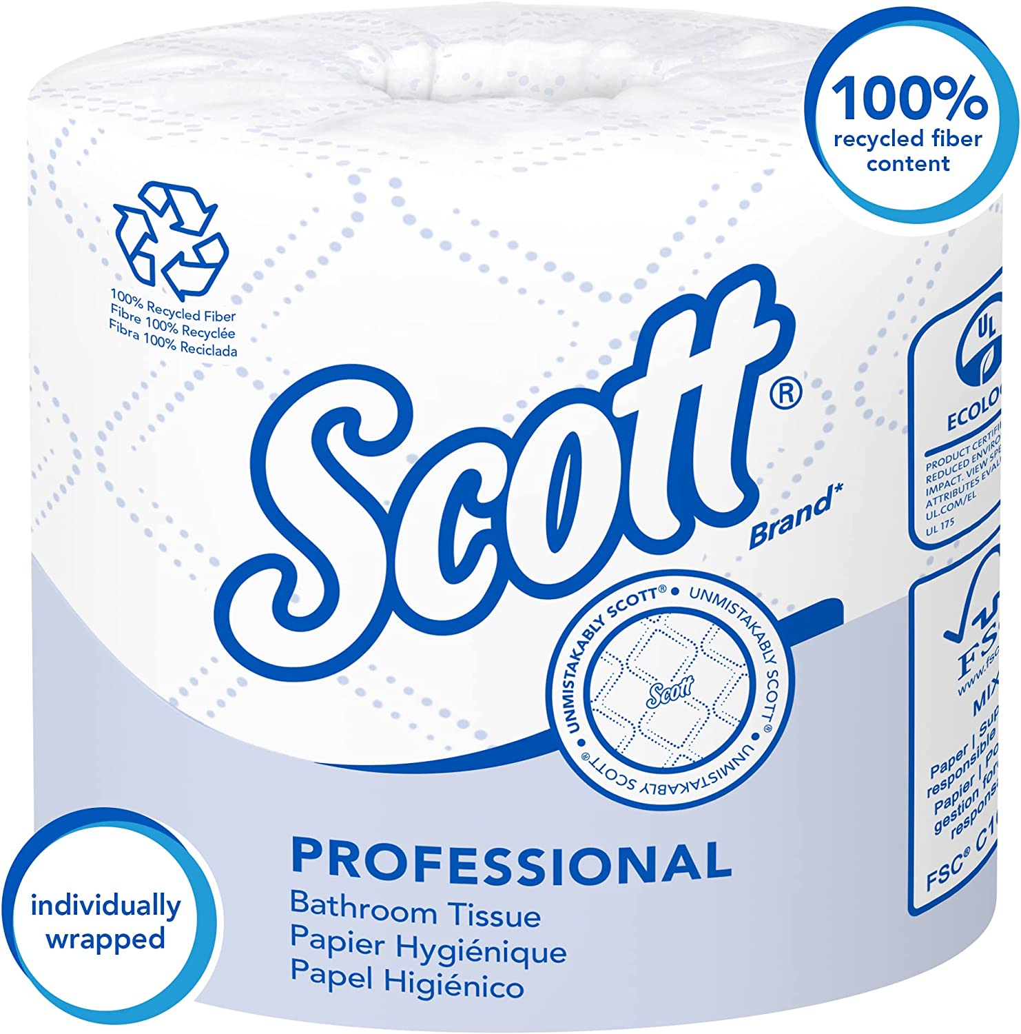 • 473 Sheets/Roll, 80 Scott Professional 100% Recycled Fiber Standard Roll Toilet Paper Rolls/Case; 37,840 Sheets/Case; with Elevated Design; 2-Ply; White; Individually wrapped rolls