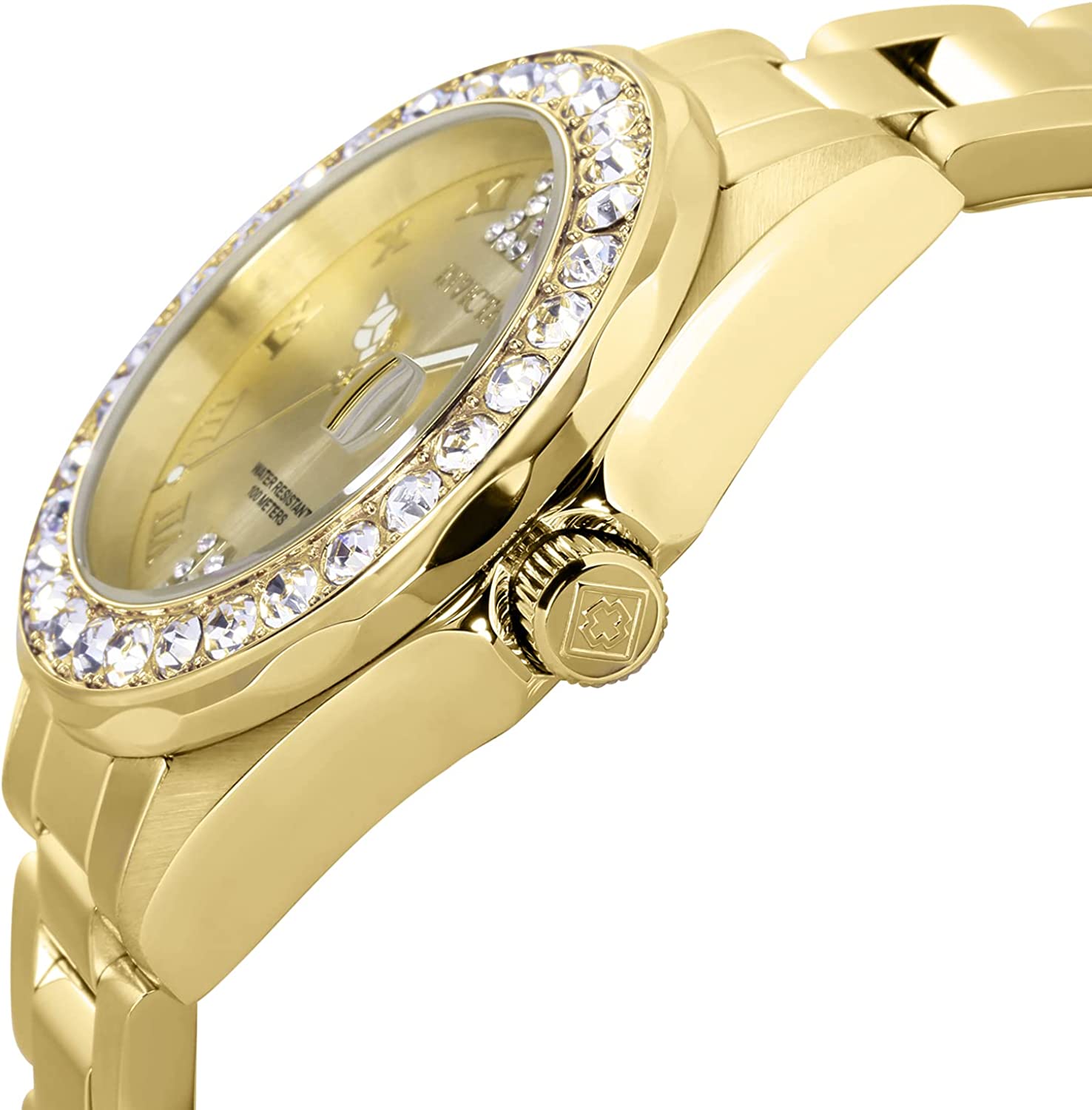 - Gold tone stainless steel case 38mm diameter x 12mm thick; Gold dial with 20 crystal accents; Luminous hands