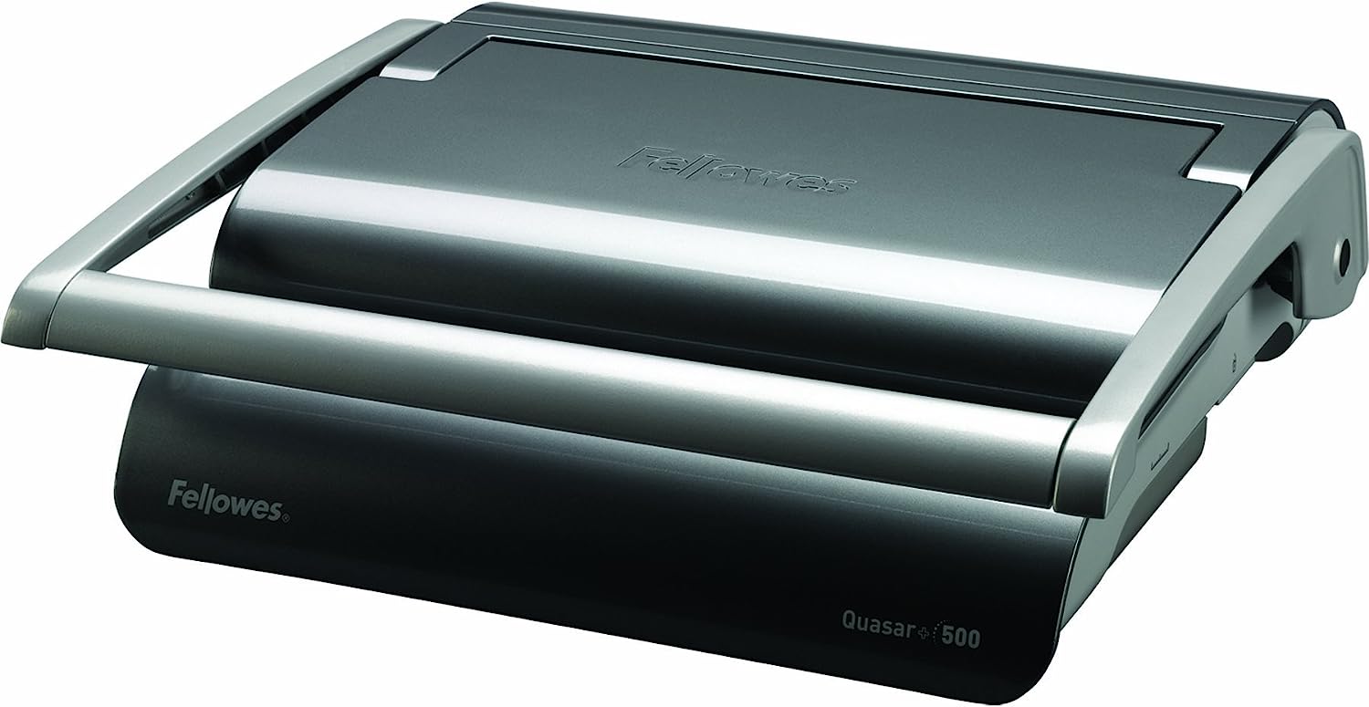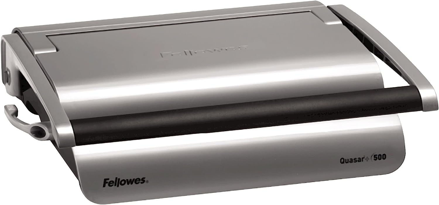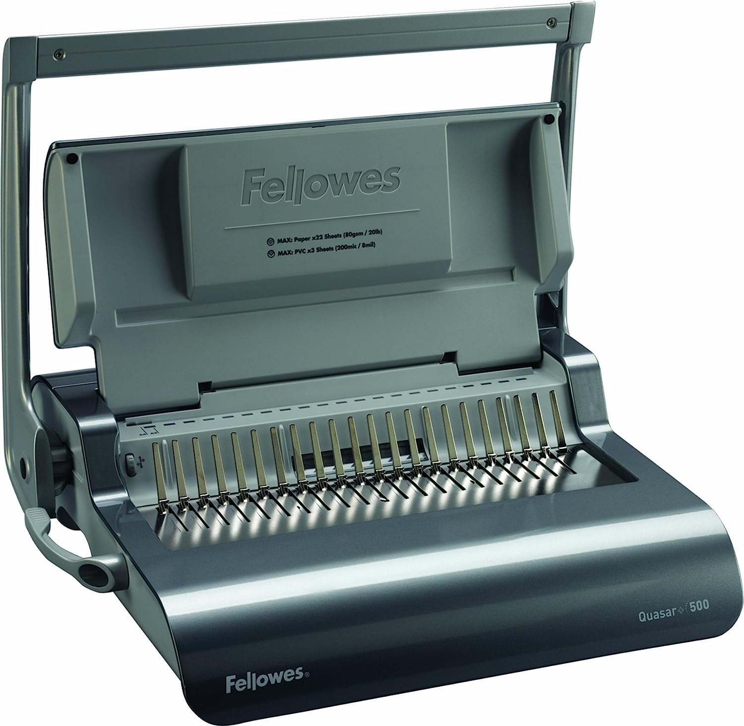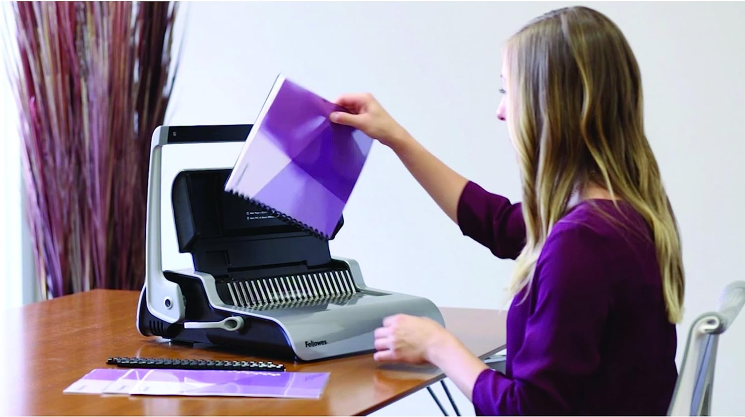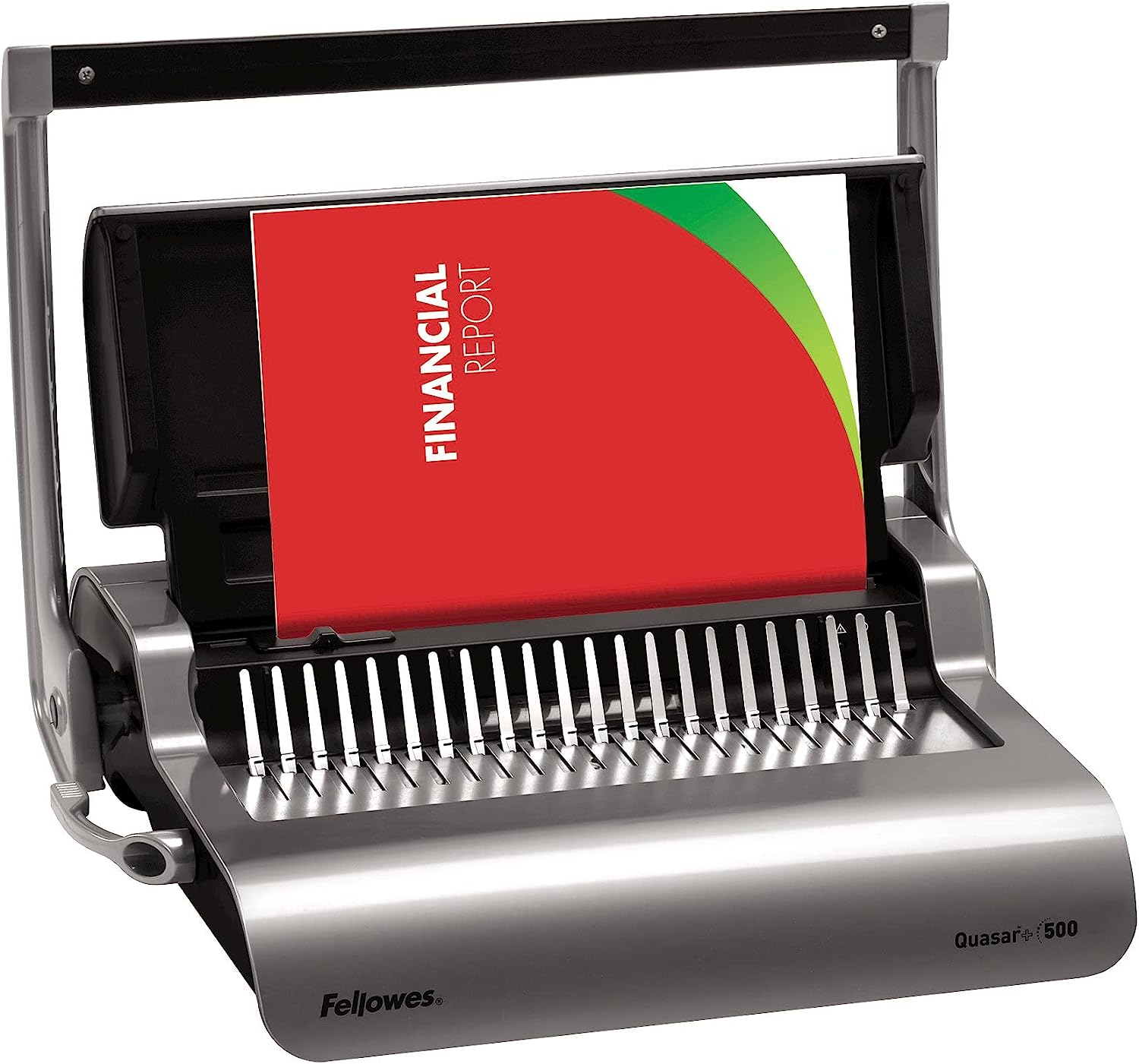 Designed for the binding needs of medium to large offices, this manual comb binding machine offers the ideal blend of performance and style. This machine manually punches up to 25 sheets at a time and binds up to 500 sheets with a 2" comb. Vertical document-loading ensures accurate punch alignment. Adjustable edge guide centers documents with ease. Efficient design allows you to punch and bind in a continuous manner. Quasar Plus Manual Comb Binding Machine also features a built-in comb storage tray with document measurement device for added convenience and quick setup. Machine also includes a binding starter pack.