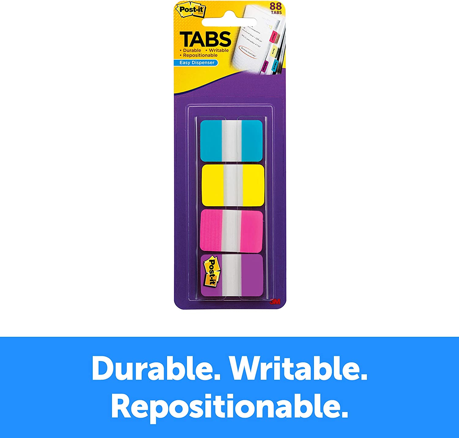 Post it Tabs in 1 inch size create necessary order by easily organizing planners and calendars into sections. Solid color bars give you flexibility to organize by color. Tabs are durable, you can write on them, and reposition as needed. They are also great for planners, binders and file folders. Tabs stick securely and remove cleanly. Aqua, Yellow, Pink and Violet. Contains 22 tabs/color and 88 tabs/on the go dispenser.