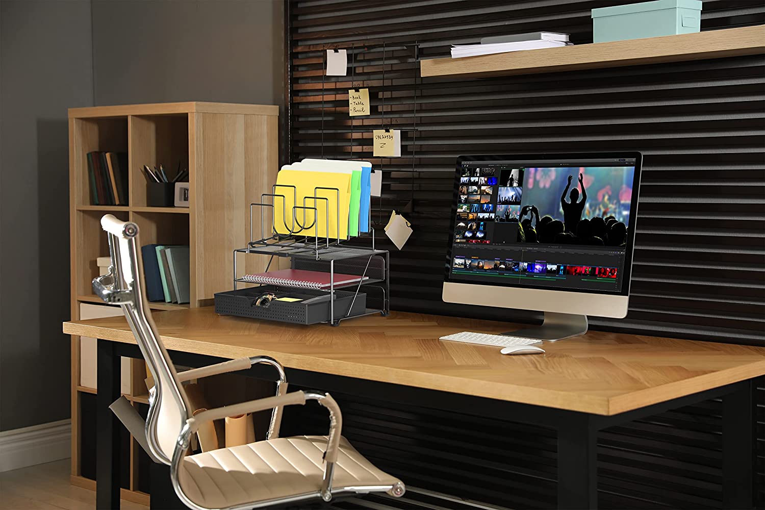 DecoBros Mesh Desk Organizer with Double Tray, 5 Stacking Sorter Sections and Sliding Drawer, Black