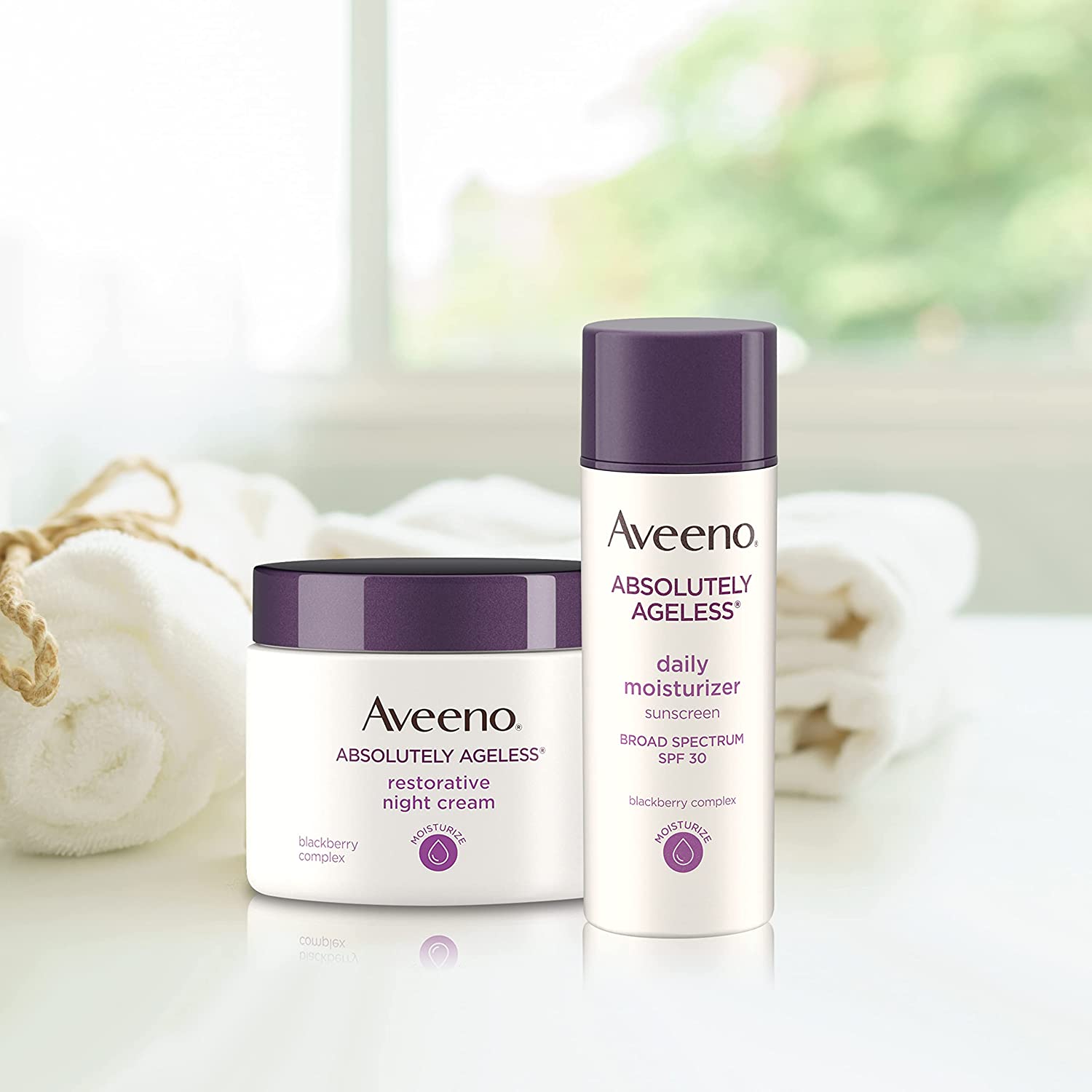 - 1.7-fluid ounce jar of Aveeno Absolutely Ageless Restorative Moisturizing Night Cream works overnight to moisturize and nourish skin