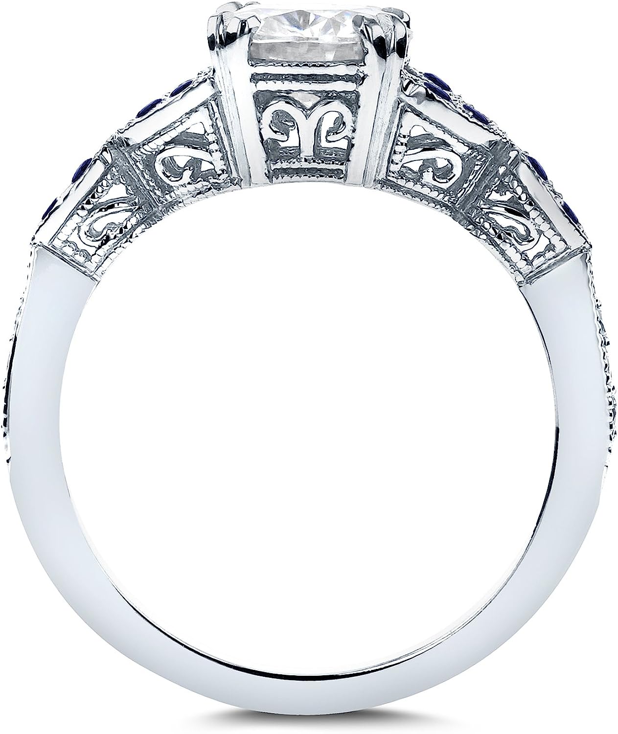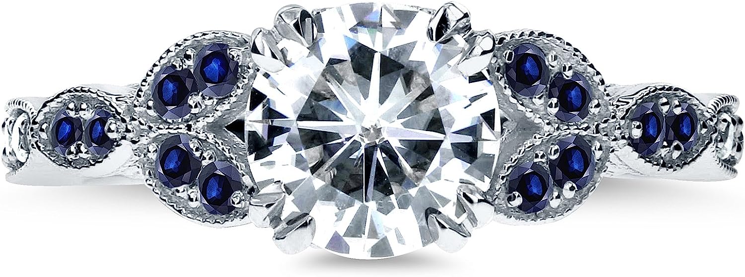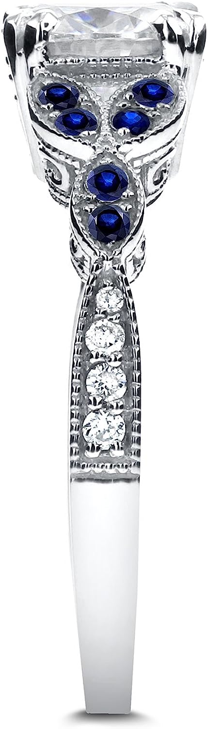 Kobelli Antique Style Round Diamond and Blue Sapphire Engagement Ring 1 1/5 CTW in 14k White Gold