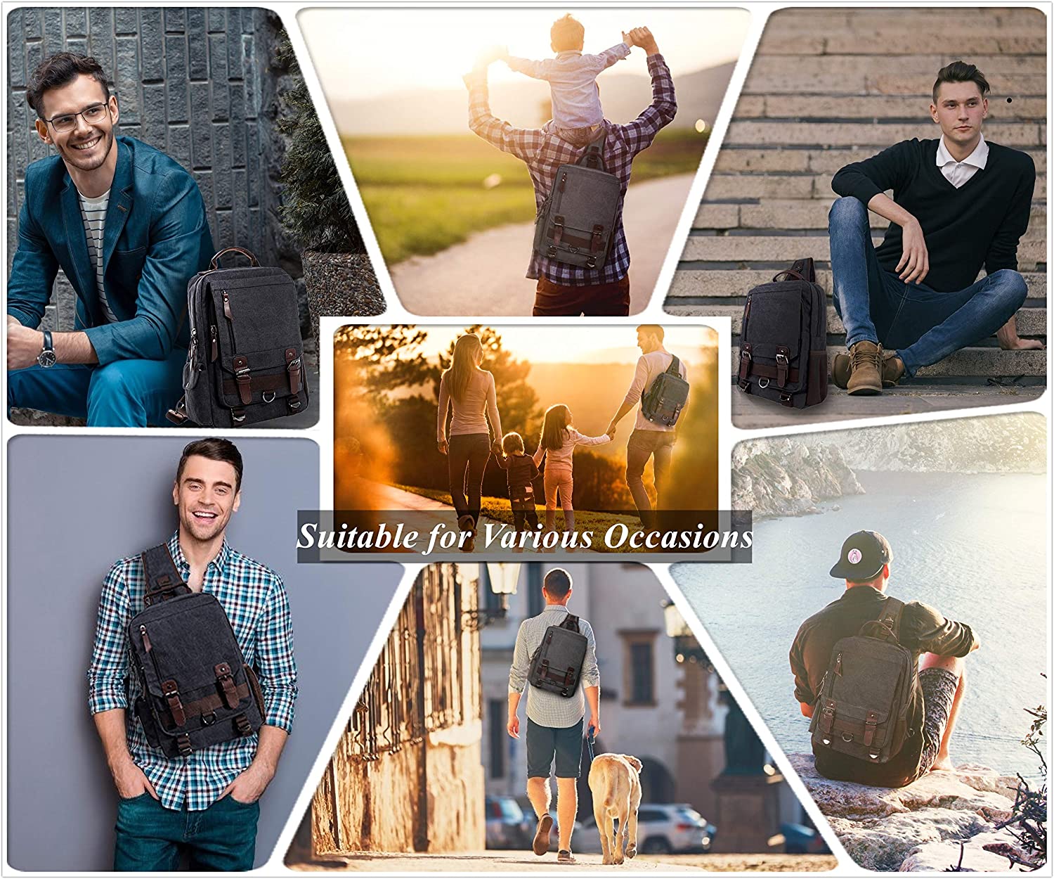 The canvas backpack is vintage and multifunctional with lots of pockets. 1 zipper pocket is in the front flap; 1 zipper pocket and 1 open pocket are under the flap; 2 side pockets. The main compartment is fitted with two zip heads and pulls: 1 inner zipper pocket; 1 inner laptop pocket; 2 inner small pockets. A small laptop, iPhone, wallet, snacks, tickets and magazine will all fit comfortably with room left over for add-ons.