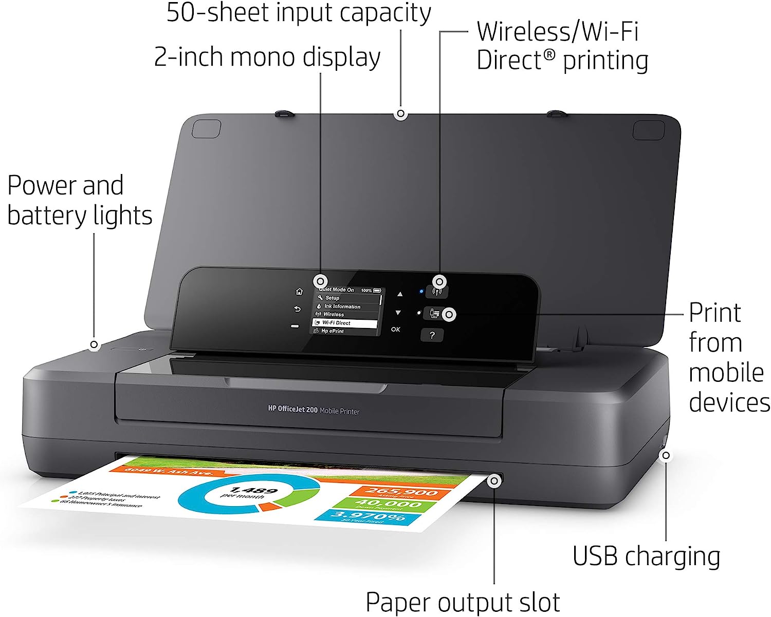 Make the world your office with powerful portable printing—no network necessary. This quick, quiet printer delivers more pages per cartridge and has a long- lasting battery life. Ideal for mobile professionals and telecommuters who need a high-quality, reliable, portable printer they can take virtually anywhere. Easy portable printing wherever you need it: Simply print from your laptop or mobile devices wirelessly, with or without a router. This durable, compact printer fits in your car, backpack, and more, for convenient printing anywhere. Start printing in minutes. HP Auto Wireless Connect makes setup easy. Lead the way with fast, easy mobile printing. Reduce charging interruptions with a long-lasting battery. Stay productive with a large and easy-to-use control panel. Set the pace for success wherever you go. Keep moving through the day with fast print speeds. Get the highest page yields of any other in-class printer, using Original HP cartridges. High-powered quality and reliability: Power through the workday. Charge from home, in your car or office, and more. Get high-quality prints time after time with a printer designed and built to be reliable. Minimize disruptions with premium design and quiet performance. Impress clients, without noisy interruptions. Plug in your AC power source to charge within 90 minutes while the printer is off, with HP Fast Charge.