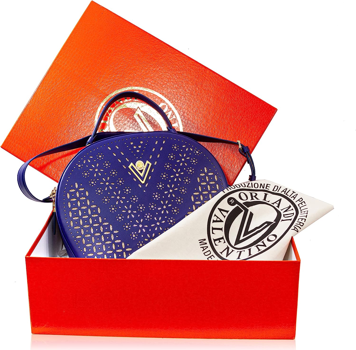 • The new collection Valentino Orlandi offers unusual combinations and refined original styling with careful attention to detail. This is a collection for a sensual and romantic woman. Turn heads and stop traffic with on trend circle shape made of laser cut hand embroidered design backed by gold leather in decadent tanzanite blue color. Featuring Swarvoski encrusted famous "V" logo. Easy to access main compartment will hold all your daily necessities.