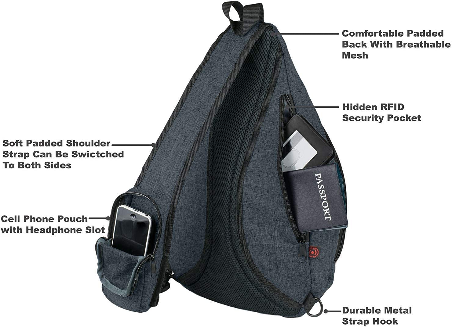Wear a Number of Ways: Wear this sling bag over either shoulder comfortably, or in the front across the chest to deter thieves. Includes convenient front cell phone pocket with headphone access.