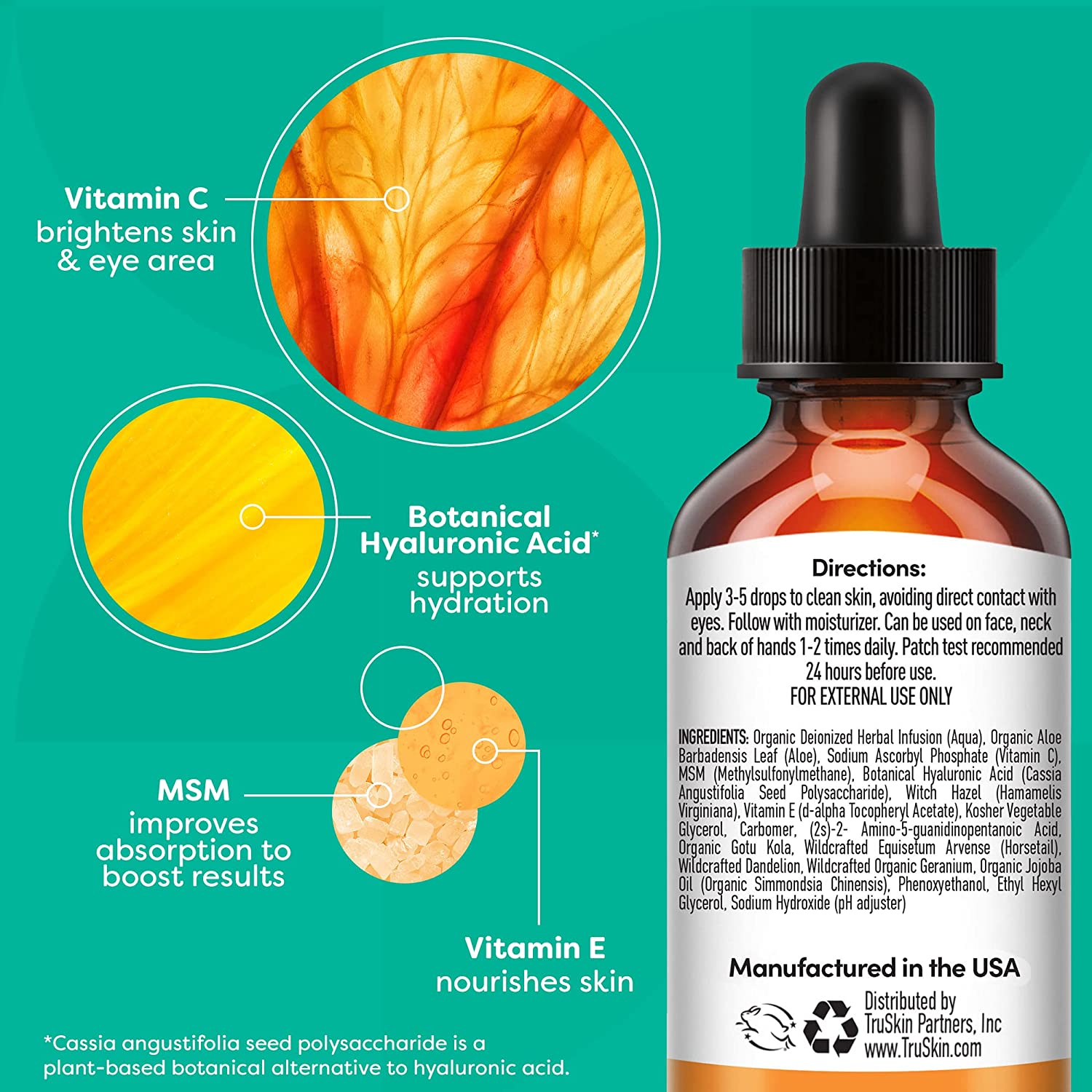 • DIRECTIONS: TruSkin Vitamin C Serum for face with hyaluronic acid can be used morning and/or night. Apply 3-5 drops of serum to clean fingertips, palm or back of hand and use fingertips to gently smooth onto face and under eyes