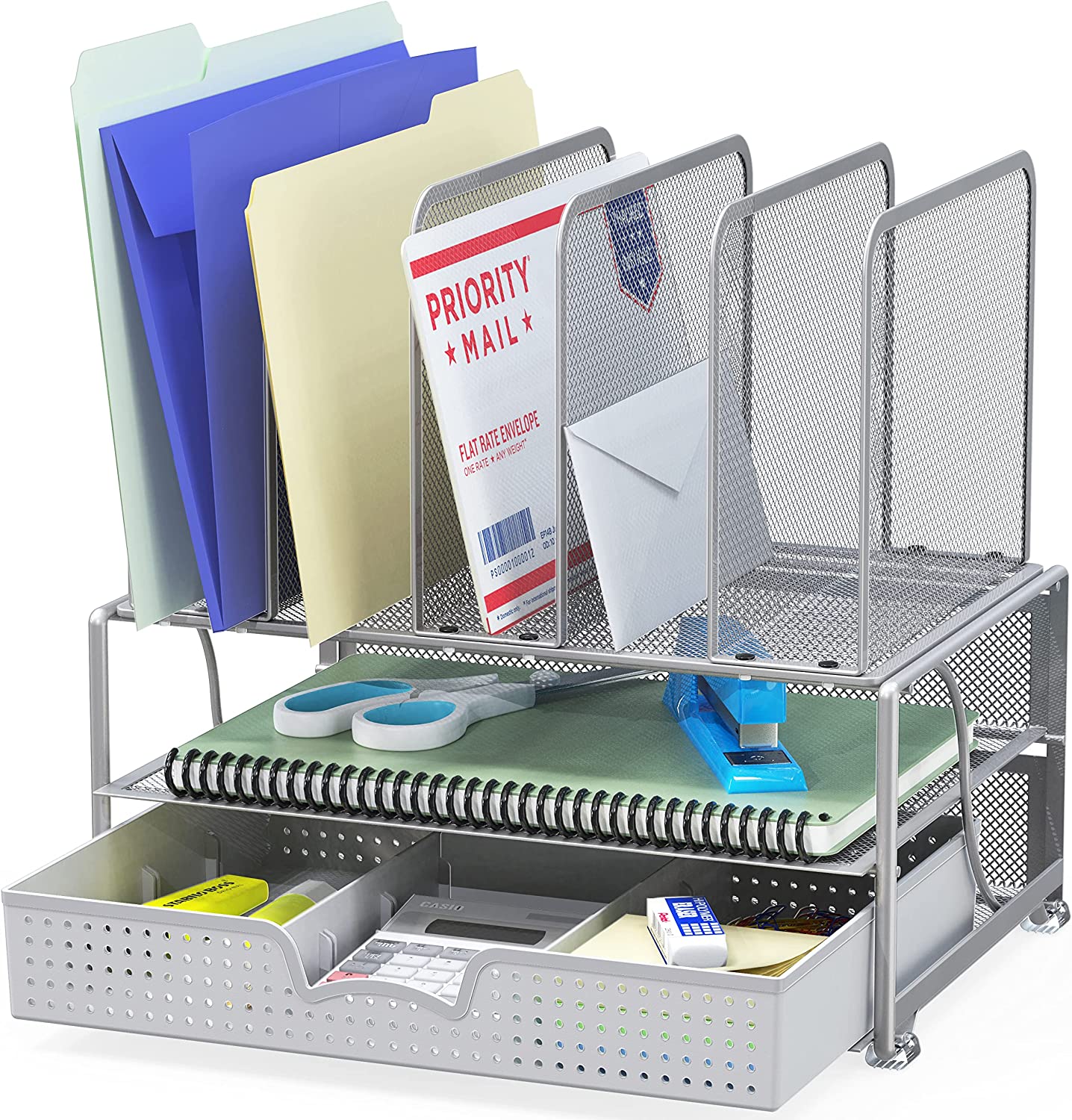 SimpleHouseware Mesh Desk Organizer with Sliding Drawer, Double Tray and 5 Upright Sections, Black
