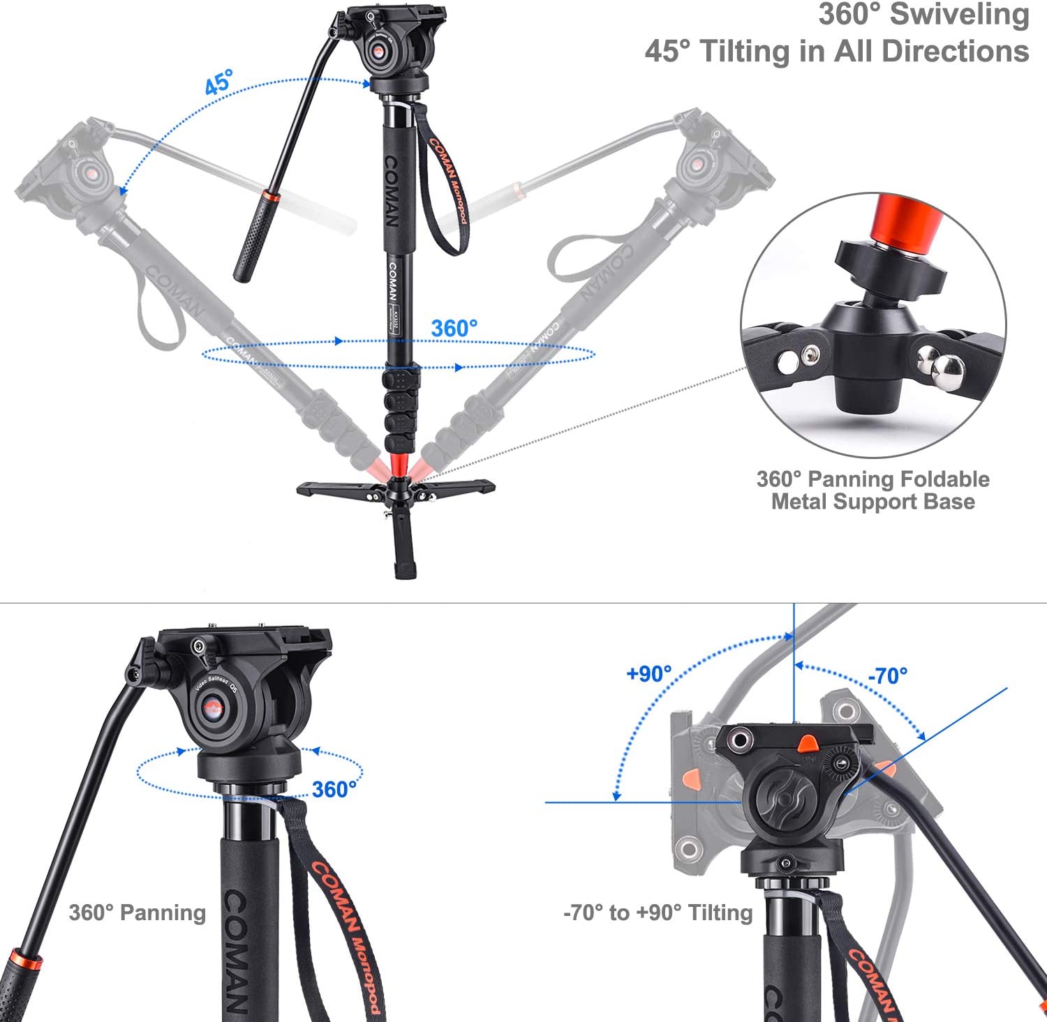 Monopod, COMAN KX3232 73.2 inch Professional Monopod Tripod Lightweight Aluminum Telescopic Camera Monopod with feet and Pan Tilt Fluid Head for DSLR Video Cameras