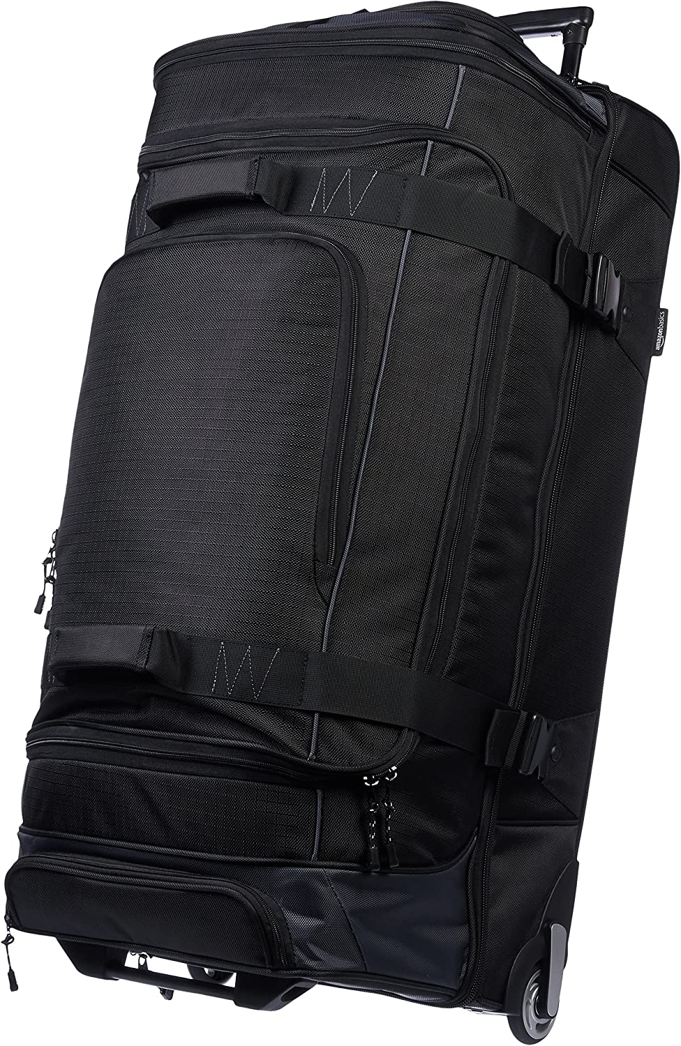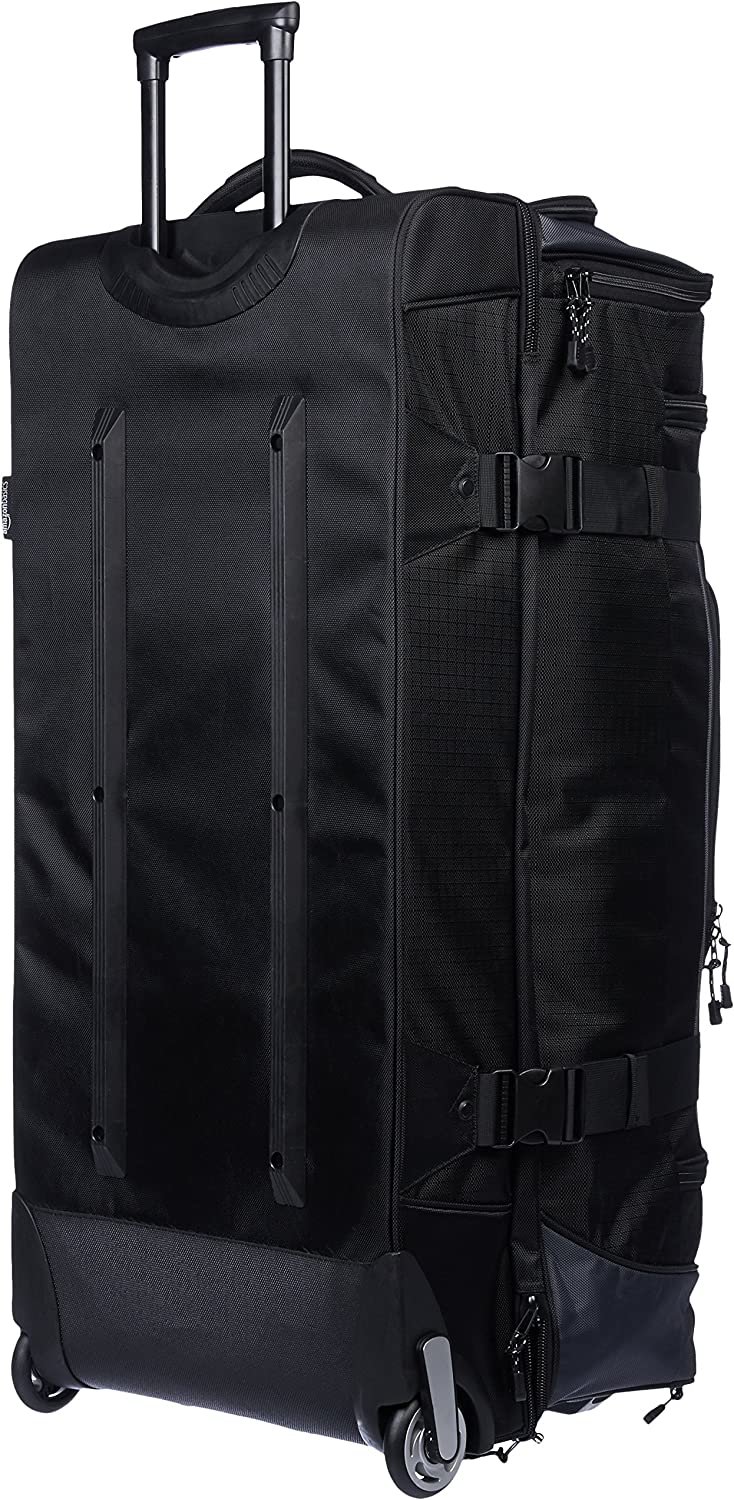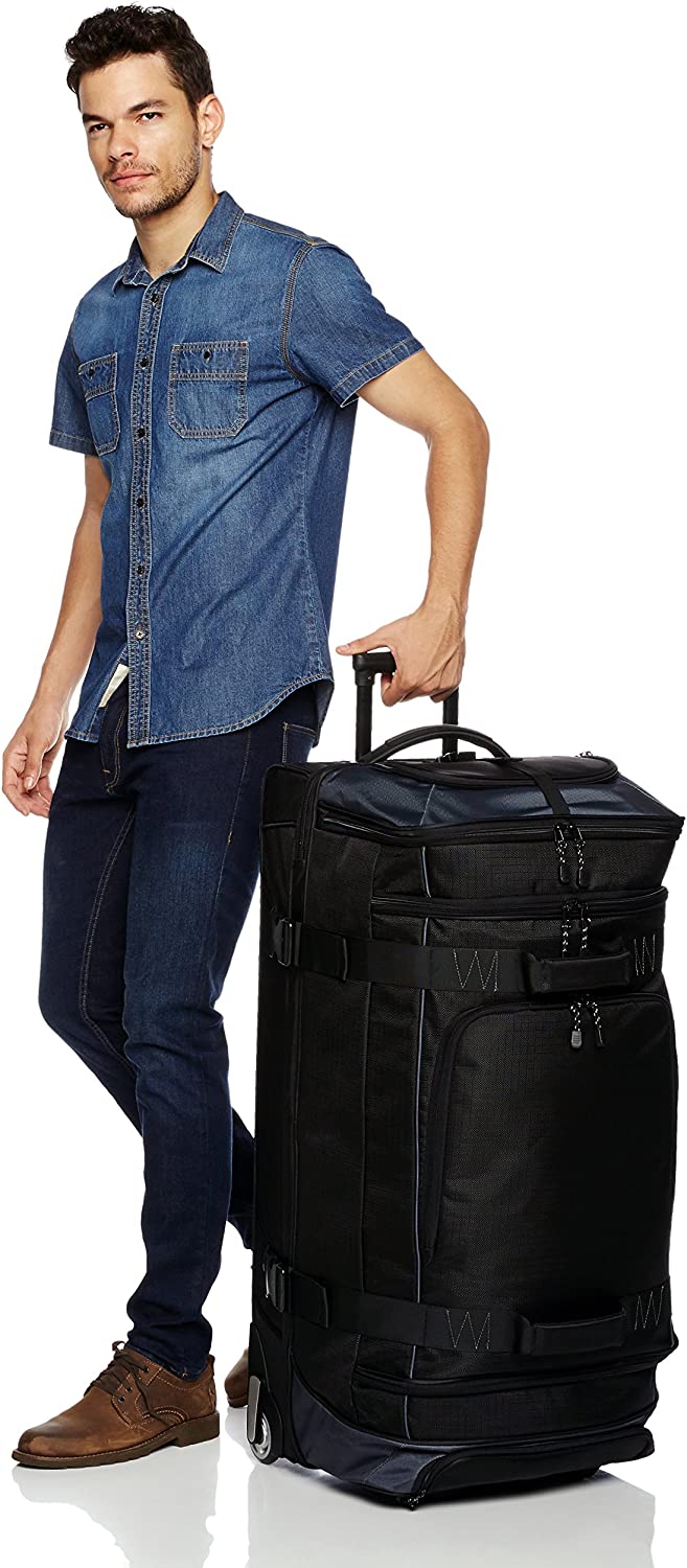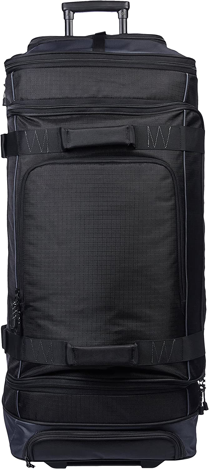 Wheeled duffel in black with grey accents for traveling in comfortable, convenient style