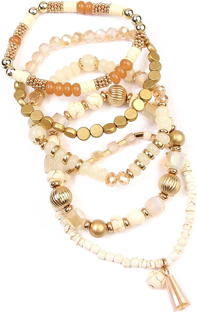 RIAH FASHION Bohemian Mix Bead Multi Layer Versatile Statement Bracelets - Stackable Beaded Strand Stretch Bangles Sparkly Crystal, Tassel Charm