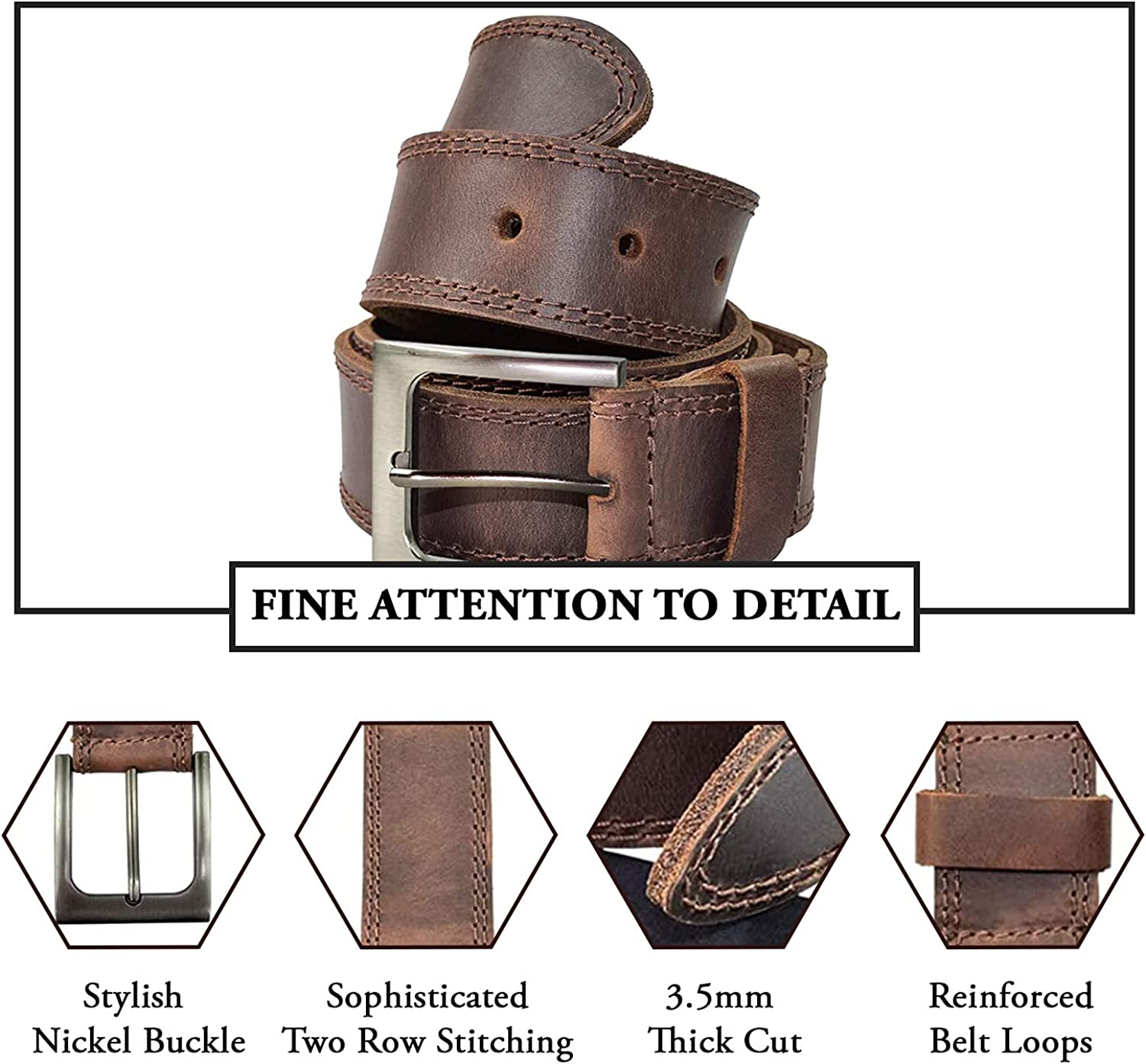 • CLASSIC NICKEL BUCKLE: The belt is adorned with a classy nickel buckle that shouts style and charm. Combined with the elegantly hand cut and hand sewn Full Grain Leather, it will serve as a fine accessory to any jeans or pants, suitable for any occasion.