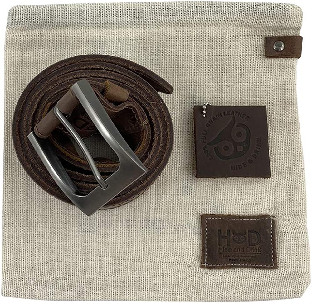 • HANDMADE FROM SOFT & ATTRACTIVE FULL GRAIN LEATHER: Hide & Drink’s belts are hand cut and handcrafted using the highest quality of leather that you will find, namely Full Grain Leather. The quality of this leather ensures a long lasting life and durability. After time and use, the leather will attain a beautiful and unique patina. Each belt is made with a width of 1.5 inches and the leather used is 3.5mm thick.