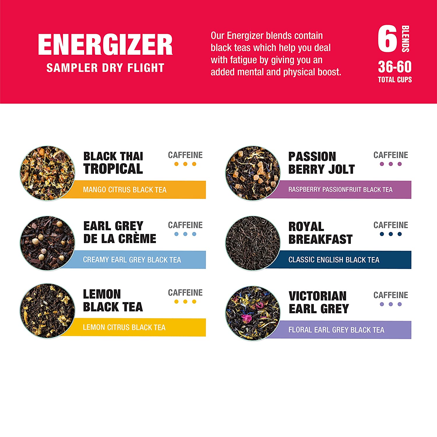 • DRY FLIGHT SAMPLERS: Looking for the perfect caffeinated tea? Our Energizer Dry Flight Sampler is just what you need! Sip on 8 different caffeinated loose leaf teas from our Energizer collection and find your favorite