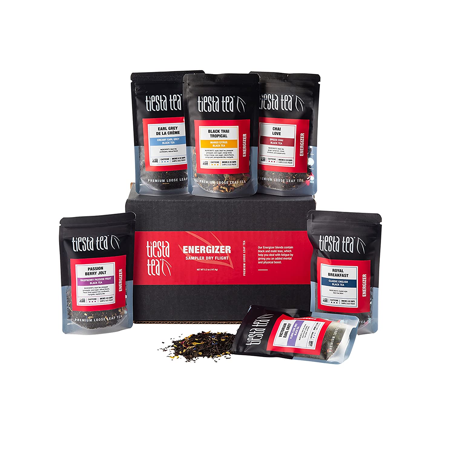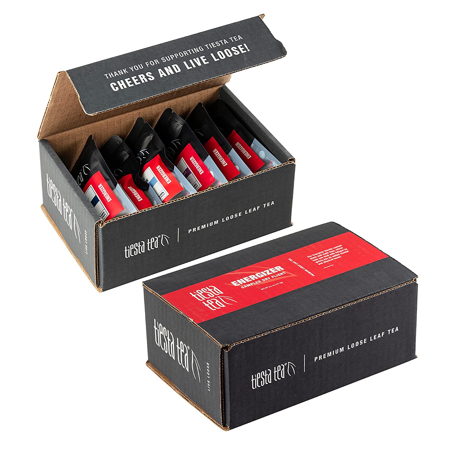 Tiesta Tea Energizer Tea Sampler Set, Up to 60 Cups, High Caffeine, Hot & Iced Tea, Loose Leaf Tea Variety Pack with Black & Chai Tea, 6 Sample Pouches (May Vary)