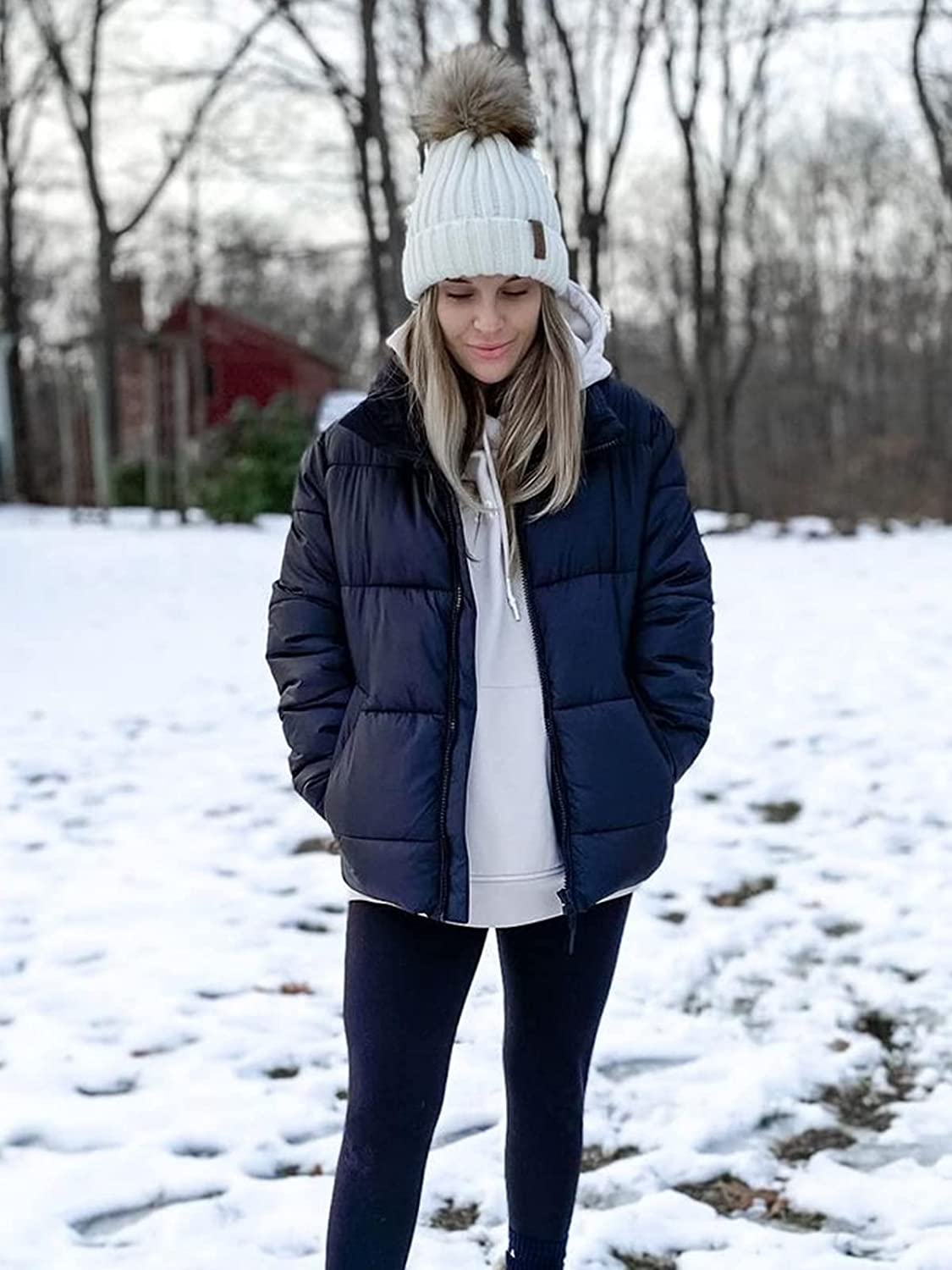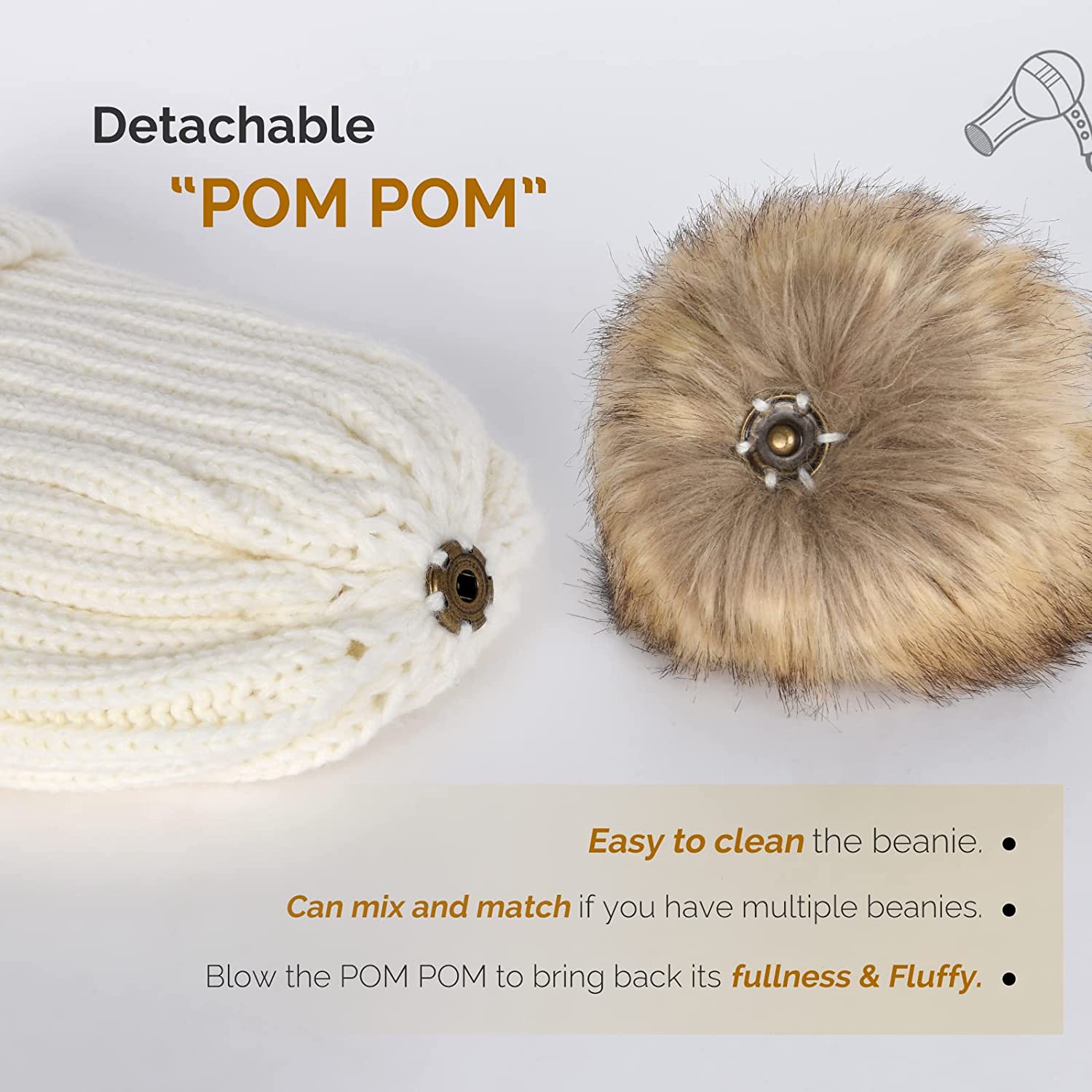 • ?Pom Pom Hat - The winter hat with a fur pompom,this puff ball is bigger,super cute and removable;We use the same color or raccoon fur faux fur pompom as the hat when they combine together will look matched;The pom pom snaps securely in place when you want to wear it, and is easily removable when you don't;