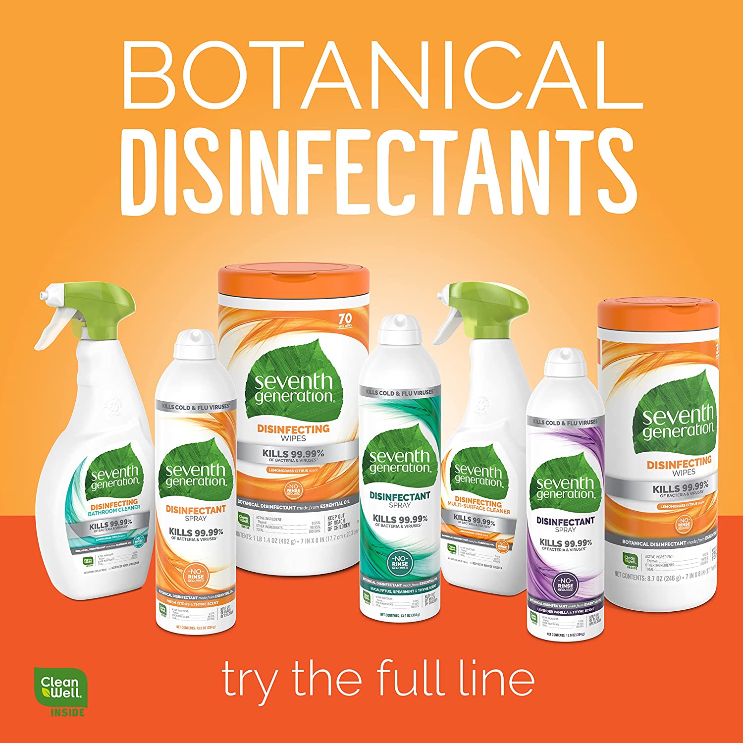 Just because you can’t see household germs, doesn’t mean they aren’t there. Seventh Generation Disinfectant Spray kills 99.99% of household germs, botanically. This includes cold and flu viruses*. The disinfecting spray formula does not require a rinse, even on food contact surfaces, and contains no synthetic fragrances or chlorine. Our Eucalyptus, Spearmint & Thyme Scent Disinfectant Spray is scented with essential oils and botanical extracts and leaves a spearmint and herbal scent. EPA registered disinfectant and deodorizer can be used around kids and pets and is suitable for use on all hard non-porous surfaces including children’s toys, pacifiers, gym equipment, food contact surfaces, and more. Try all the Seventh Generation Household Products; All Purpose Cleaner, Stone Cleaner, Wood Cleaner, Glass Cleaner, Granite Cleaner, toilet bowl cleaner, and disinfectant cleaner products. At Seventh Generation, we do business differently. We believe our products are healthy solutions for use within your home–and for the community and environment outside it. Not only that, but we believe it is our responsibility to set a course for a more mindful way of doing business, where companies act as partners with other stakeholders to create a brighter future for the whole planet. Seventh Generation is proud to be a Certified B Corporation. B Corps are certified to be better for workers, better for communities, and better for the environment. By choosing Seventh Generation products, you’re joining us in nurturing the health of the next seven generations. A partnership with the CleanWell Company, makers of the patented thyme-based disinfecting technology, brings you a line of Seventh Generation Disinfecting Sprays with CleanWell Inside. *Kills over 99.99% of household germs, specifically: Influenza A virus, H1N1, Rhinovirus type 37, Staphylococcus aureus, Salmonella enterica, Pseudomonas aeruginosa and Escherichia coli.