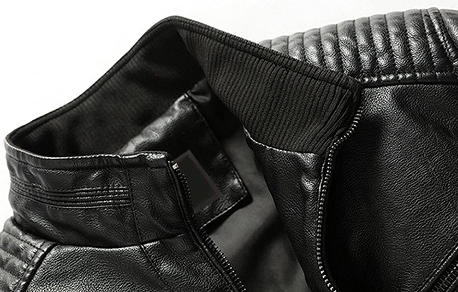 Ribbed stand collar,full zipper,pockets,adjustable zipper cuffs,stitching details,motorcycle jacket style