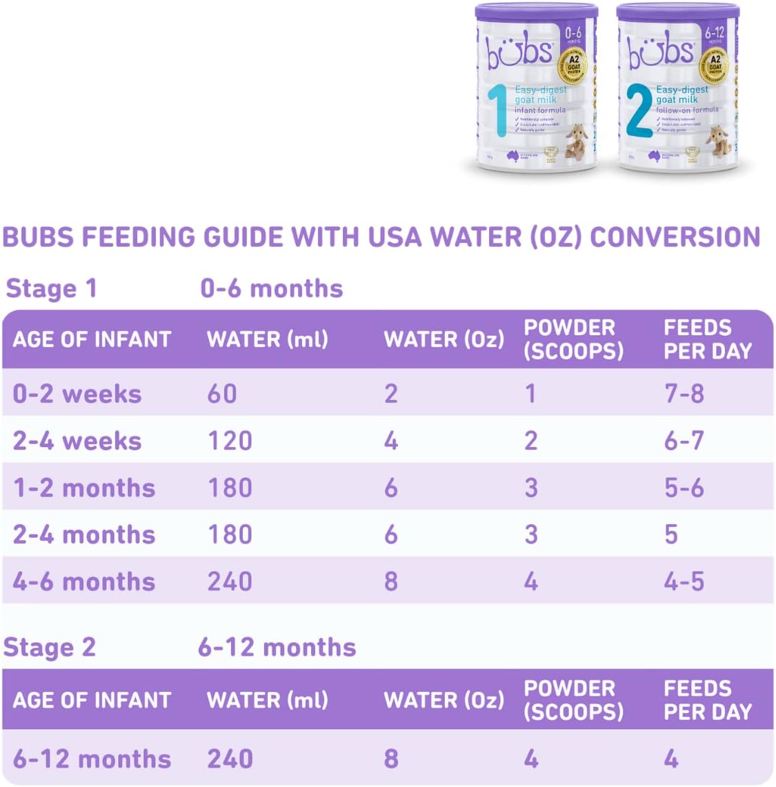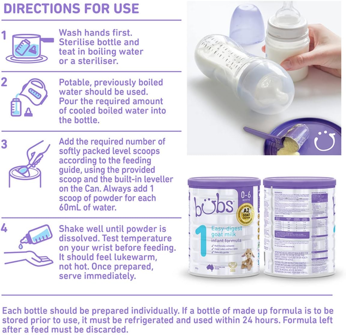 About this item            NATURALLY GENTLE: Bub's Goat Milk Infant Formula Stage 1 is an Australian Made baby formula exclusively formulated for sensitive tiny tummies ages 0-6 months feeding up to 8 times per day, all while made to ensure safety, quality, purity, and nutrition   PURE & BALANCED: Our Bubs goat milk is proudly sourced from our high-quality farmers. Naturally containing A2 Goat Protein, the unique structure of the proteins and fats found makes it easier for little bodies to break down and digest  GOODNESS FROM THE FARM: Bubs Easy-digest goat milk Infant Formula Stage 1 is suitable for sensitive tummies, securely formulated non-GMO, with no artificial colors, flavors, or preservatives, and selected for Clean Label Purity Award  NO HIDDEN NASTIES: Our Bubs Goat Milk Infant Formula gives parents peace of mind and babies a happy start to their life, with A2 Goat Protein, Omega 3, plus Prebiotics, and may be a good alternative for formula fed babies with sensitive tummies  TRUSTED FOR OVER 17 YEARS: Founder Kristy Carr, a mom of three, has a mission to inspire the next generation of happy babies, with Clean Label nutritional products that provide the foundation for setting up a lifetime of good eating habits