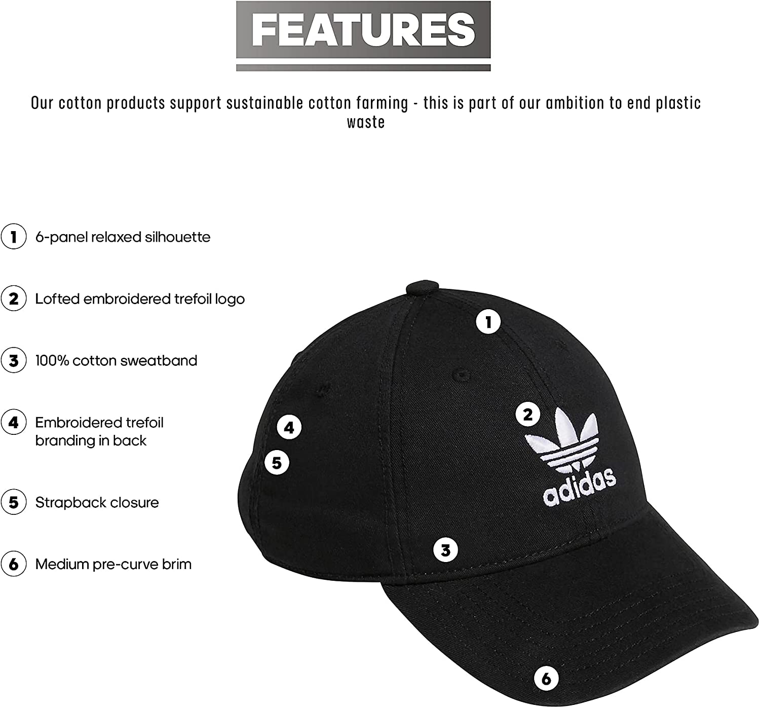 Cotton twill and a curved brim gives this cap an easy, casual vibe. the six-panel hat flashes trefoil embroidery in front, and an adjustable slider in back provides a just-right fit.