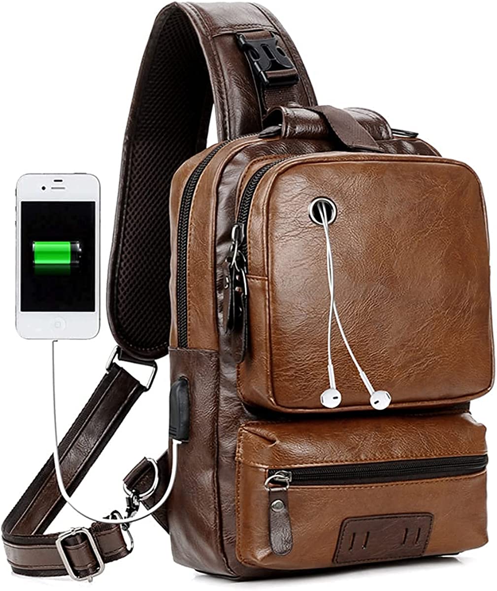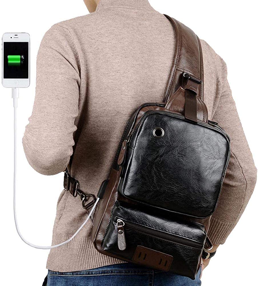 Small Black Sling Crossbody Backpack Shoulder Bag for Men Women Vintage PU Leather Sling Backpack Cycling USB Charger
