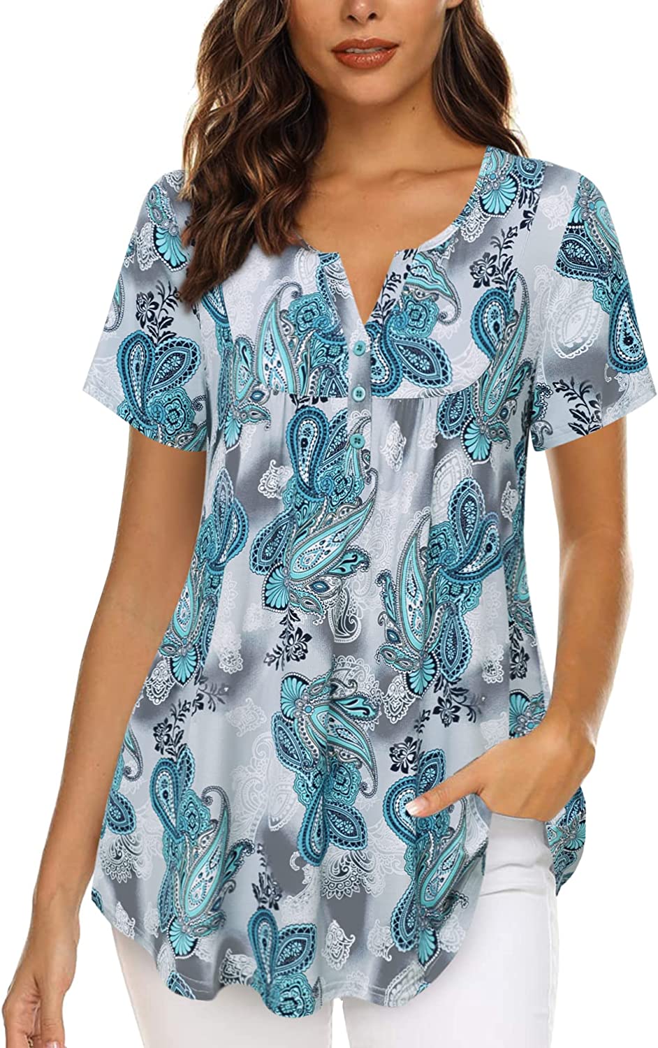 Features: Henley v neck,Button-up,Paisley pattern or solid color, cute front ruffle and flowy hem can perfectly modify the belly, good length can cover hips and easy to pair with leggings, pants and shorts etc, very casual, soft, lightweight and comfortable