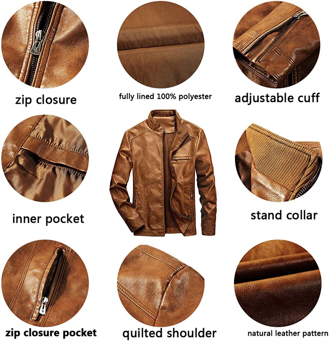 Design:casual lightweight leather jacket;classic stand collar;front zip-up closure and zip in pockets and cuffs;2 side zippered hand pockets,1 zippered chest pocket(not real pocket)and 1 inside pocket,multi pockets offer you enough and safe room for your phone,cards or other accessories.