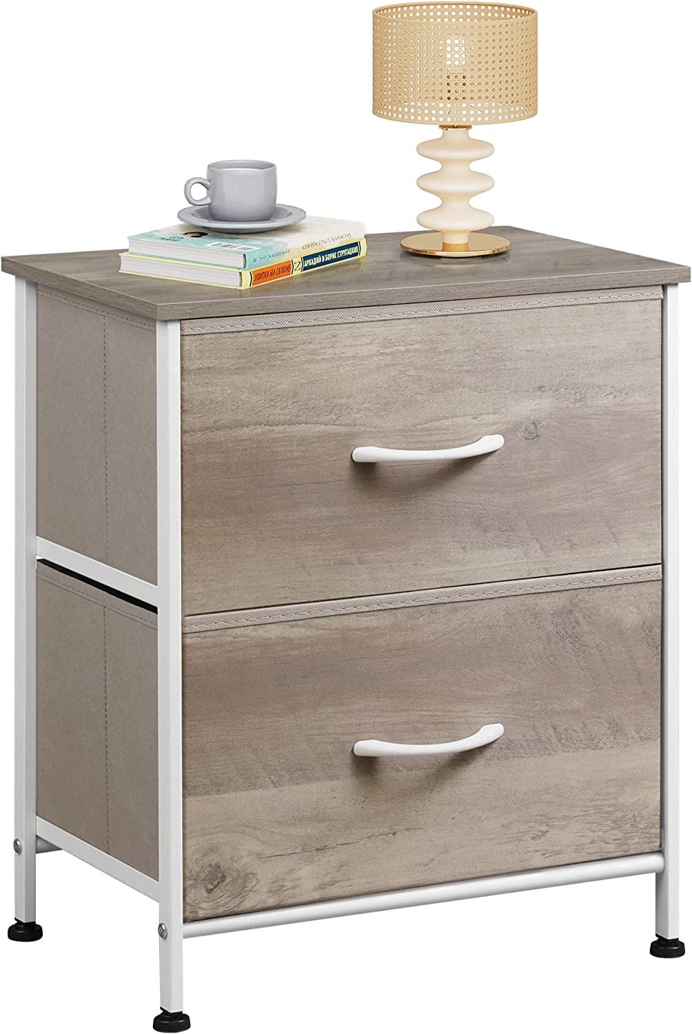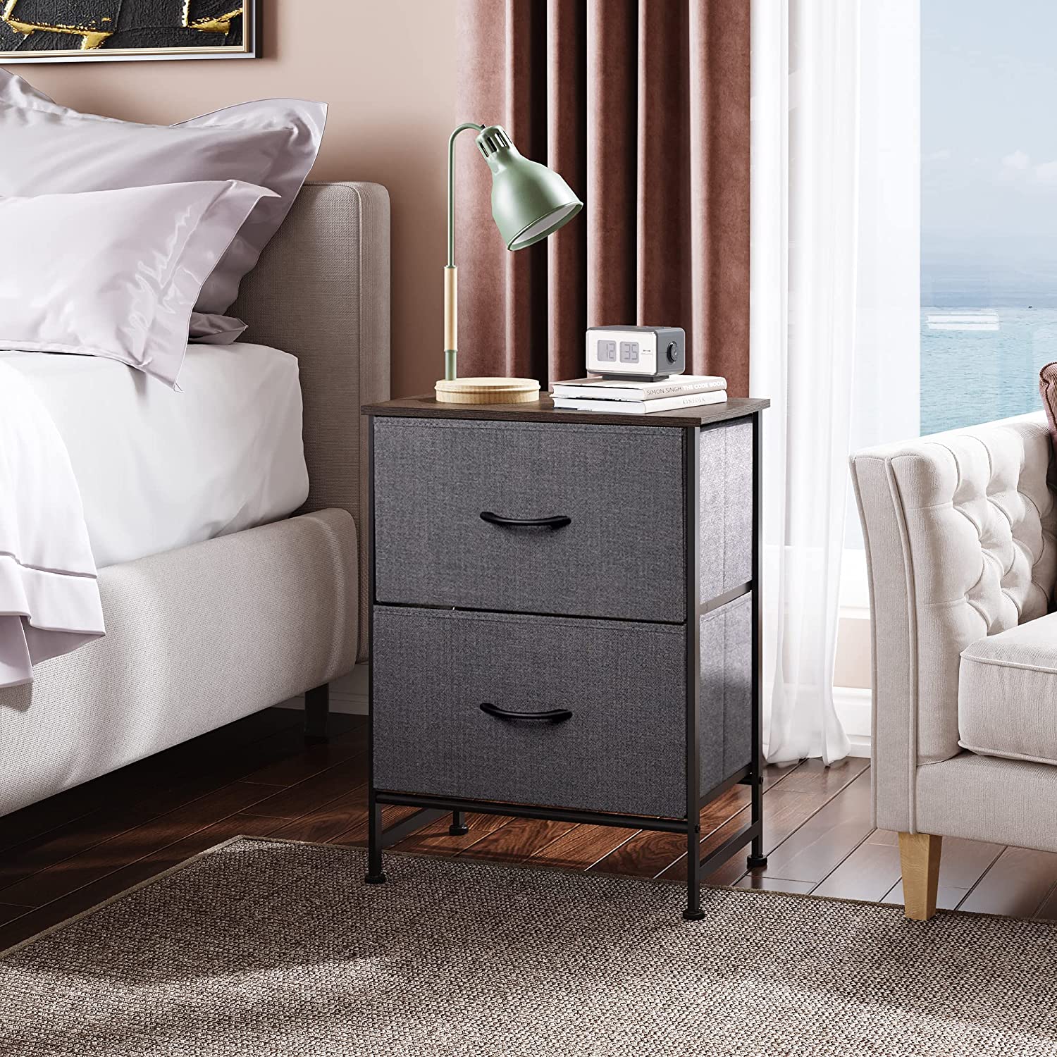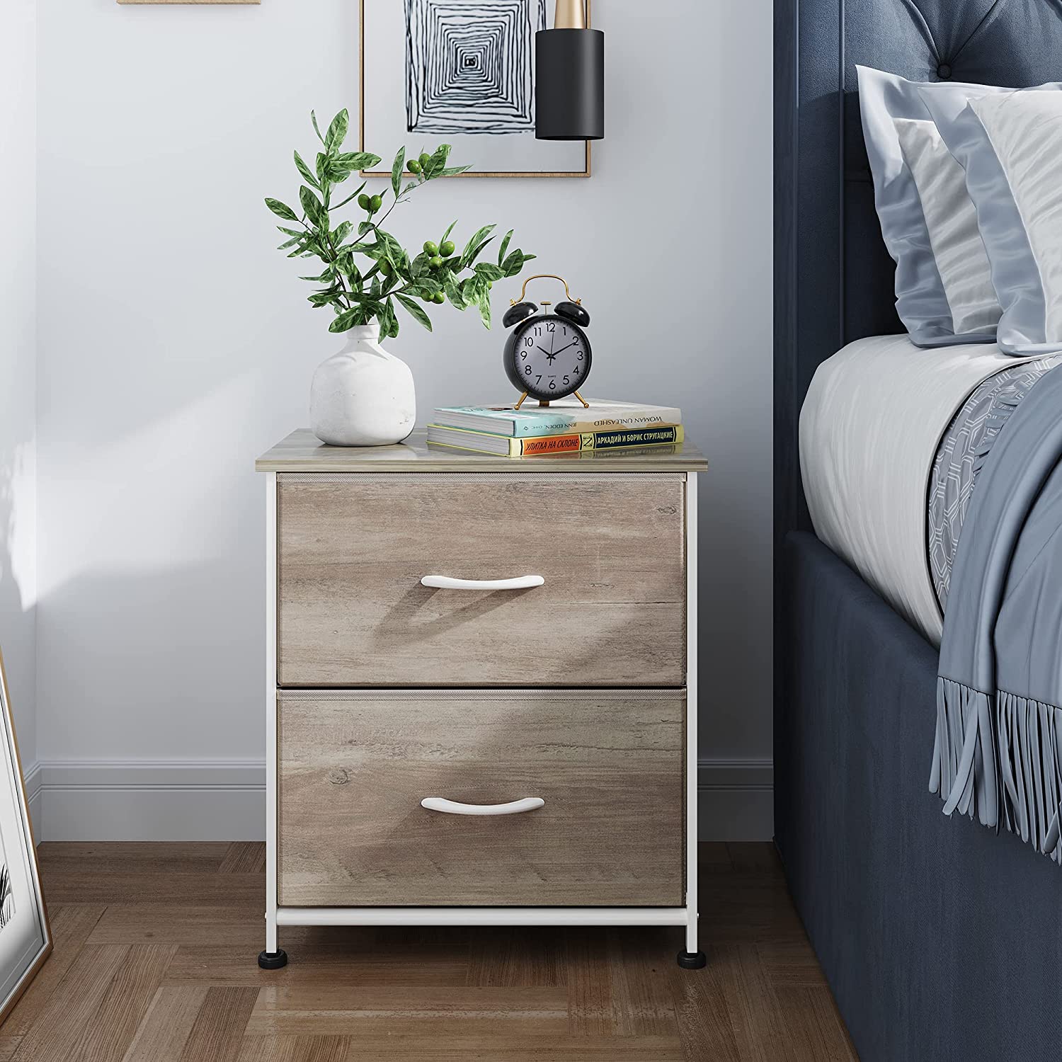 SPACIOUS STORAGE: The 2 fabric drawers of the small dresser offer large storage space for nighttime necessities. The wood top is ideal to place alarm clock, phone, charger, eyeglasses, keeping them in your reach.