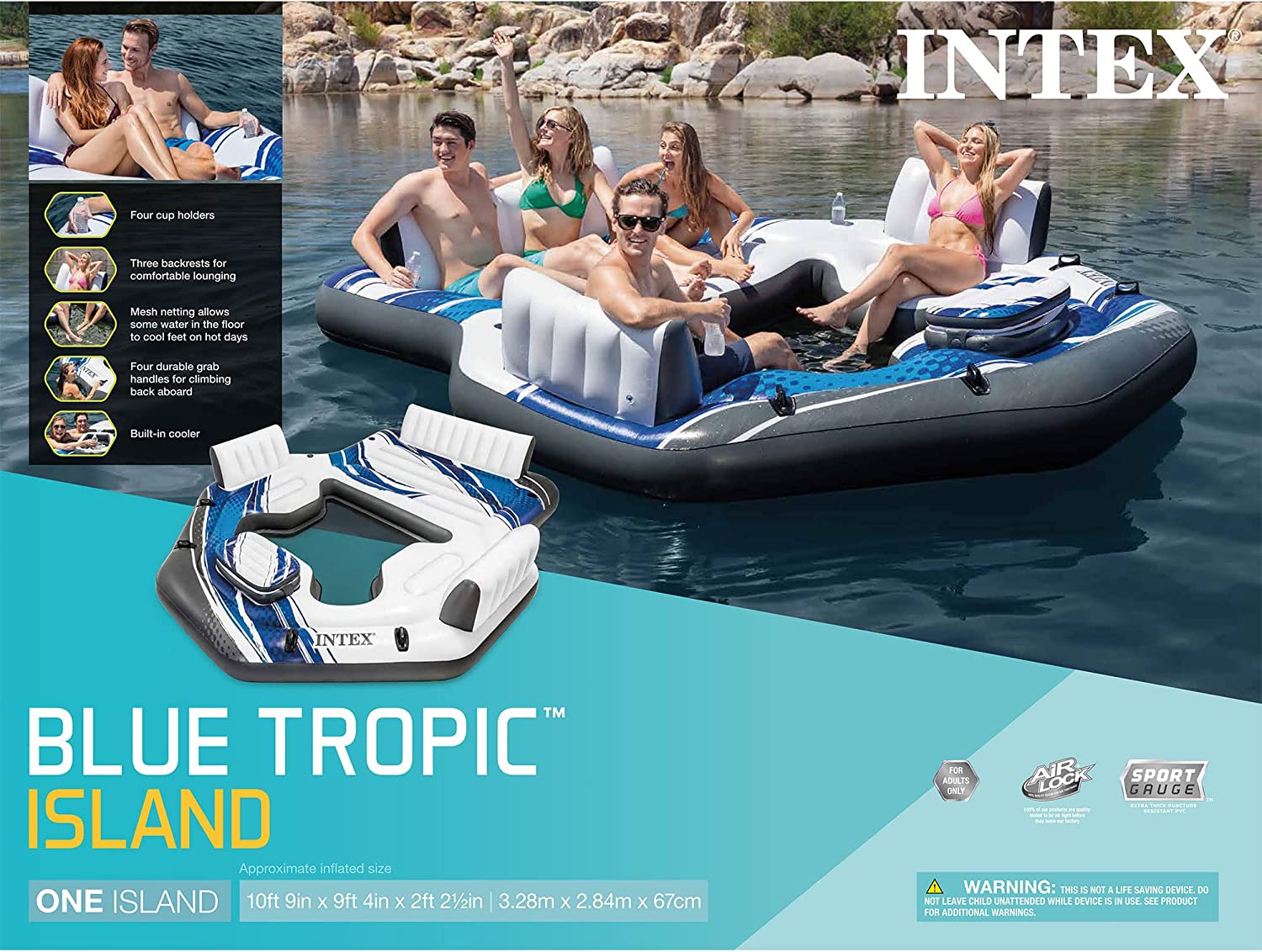 Load up your friends and family and relax on the water with the Blue Tropic Inflatable Water Float from Intex. Your pals will love cracking open a few cold drinks on this raft as you ride the waves of the water. With 4 cup holders and a built-in cooler, you can keep your favorite beverage within reach while the others stay extra chill. Even on the hottest summer days, you're able to remain cool with the mesh floor netting. Featuring 3 backrests, this raft provides maximum comfort as you float in the lake or swimming pool. Quickly inflate the float and be on the water in no time. The heavy-duty handles allow you to climb aboard with ease and ensure simple transportation to and from the water. When not in use, fold the raft for compact storage. Float out and relax for the day with the Blue Tropical Island Floating Raft from Intex.