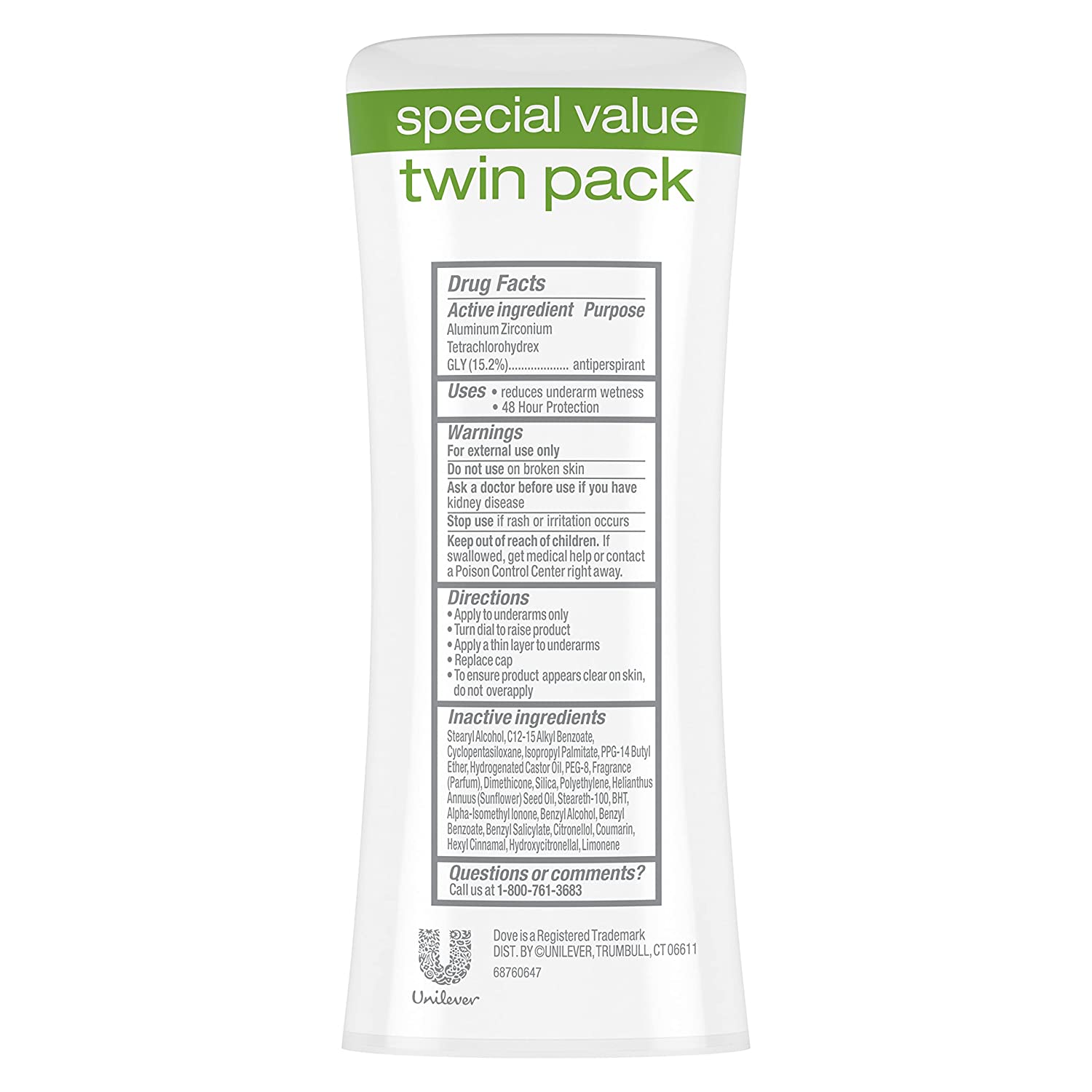 Infused with the fresh fragrance of crisp cucumber and honeydew melon blended with green tea, Dove Advanced Care Cool Essentials Antiperspirant Deodorant Stick is perfect if you’re looking for a long lasting, invigorating, and fresh scent. It's also a great choice if you're looking for a deodorant for sensitive skin. With an alcohol free formula that’s kind to skin, this deodorant helps to relieve the irritation that shaving can cause. Dove antiperspirant deodorant, enriched with our signature 1/4 moisturizers with natural oil, cares for your delicate underarm skin – leaving your underarms feeling healthy and protected. As much as it cares for your skin, this deodorant for women doesn’t compromise on effective antiperspirant protection. Keeping you fresh, this gentle deodorant protects from sweat and odor for up to 48 hours. For best results, apply this Dove antiperspirant deodorant to dry skin after showering and enjoy fresh, comfortably dry skin from morning to night. Dove is Certified Cruelty Free by PETA because we believe that real beauty is cruelty free. We’re on a mission to help women raise their selfesteem because we believe beauty should be a source of confidence, not anxiety. Dove Antiperspirant Deodorants deliver effective underarm protection and are kind to skin, so women can be free of underarm inhibitions and live beautifully unselfconsciously.