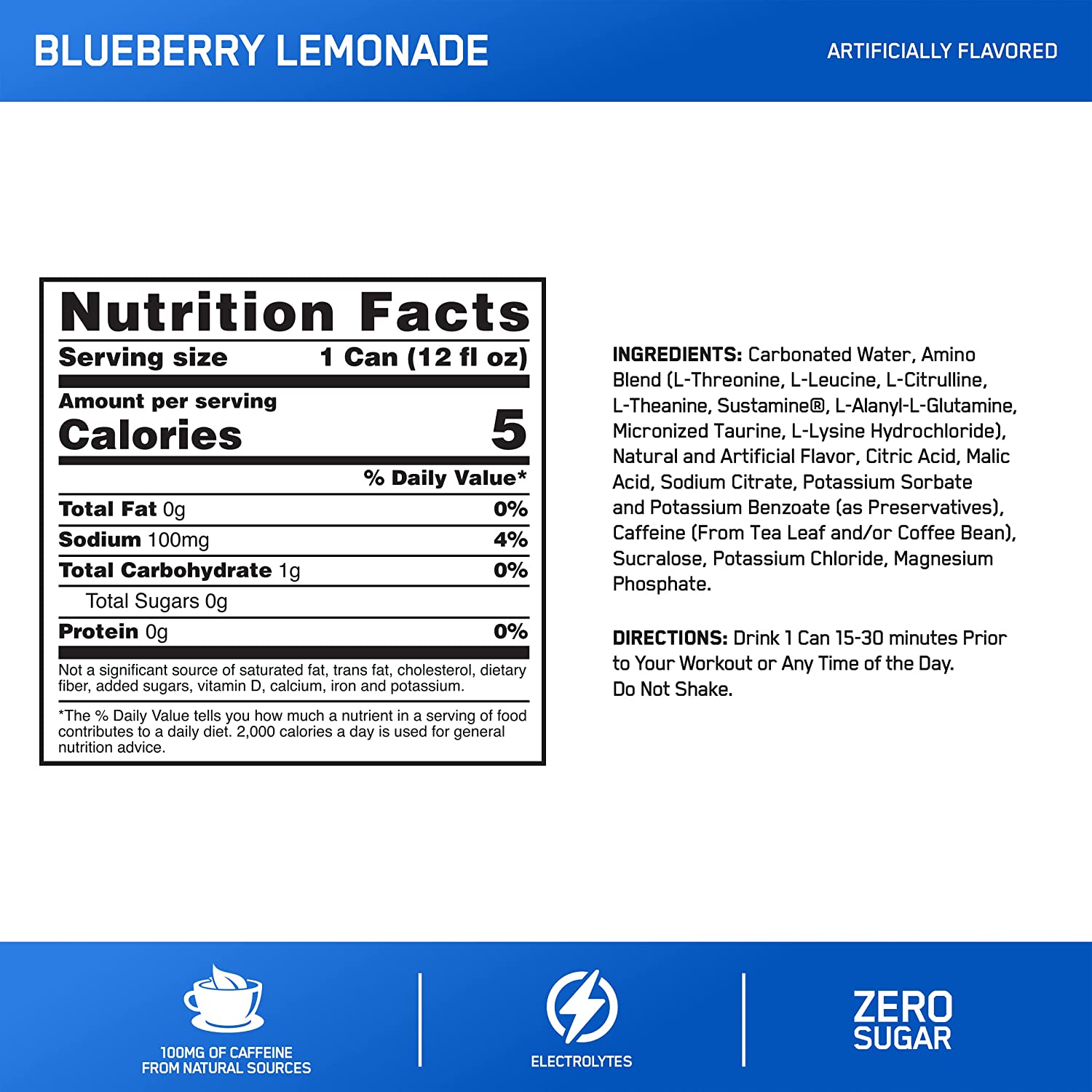 Optimum Nutrition Amino Energy Drink + Electrolytes for Hydration - Sugar Free, Amino Acids, BCAA, Keto Friendly, Sparkling Drink - Blueberry Lemonade, Pack of 12 (Packaging May Vary)