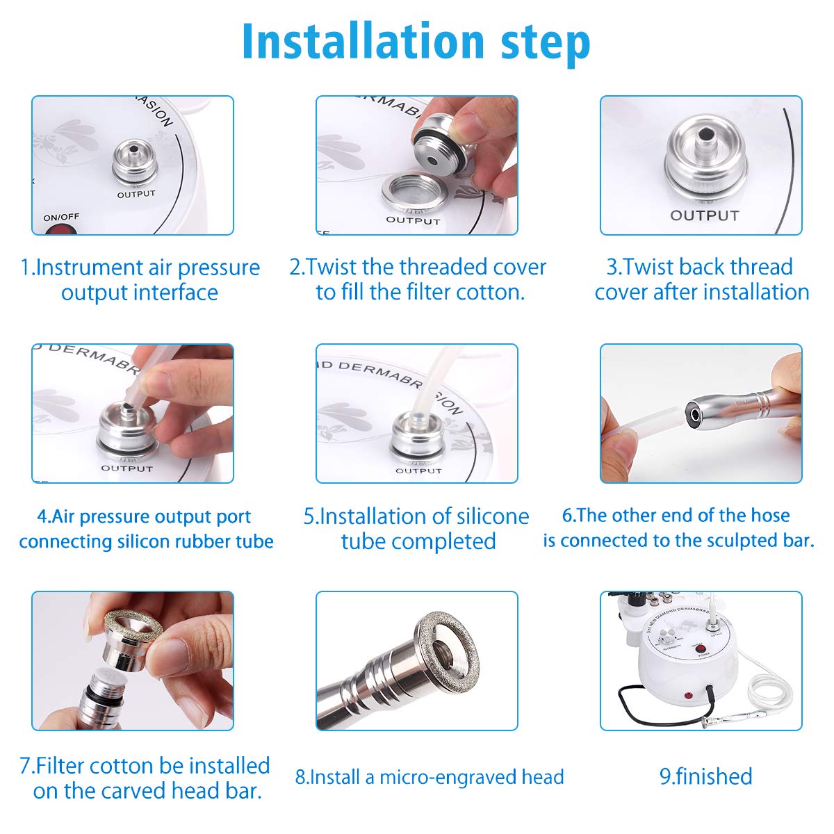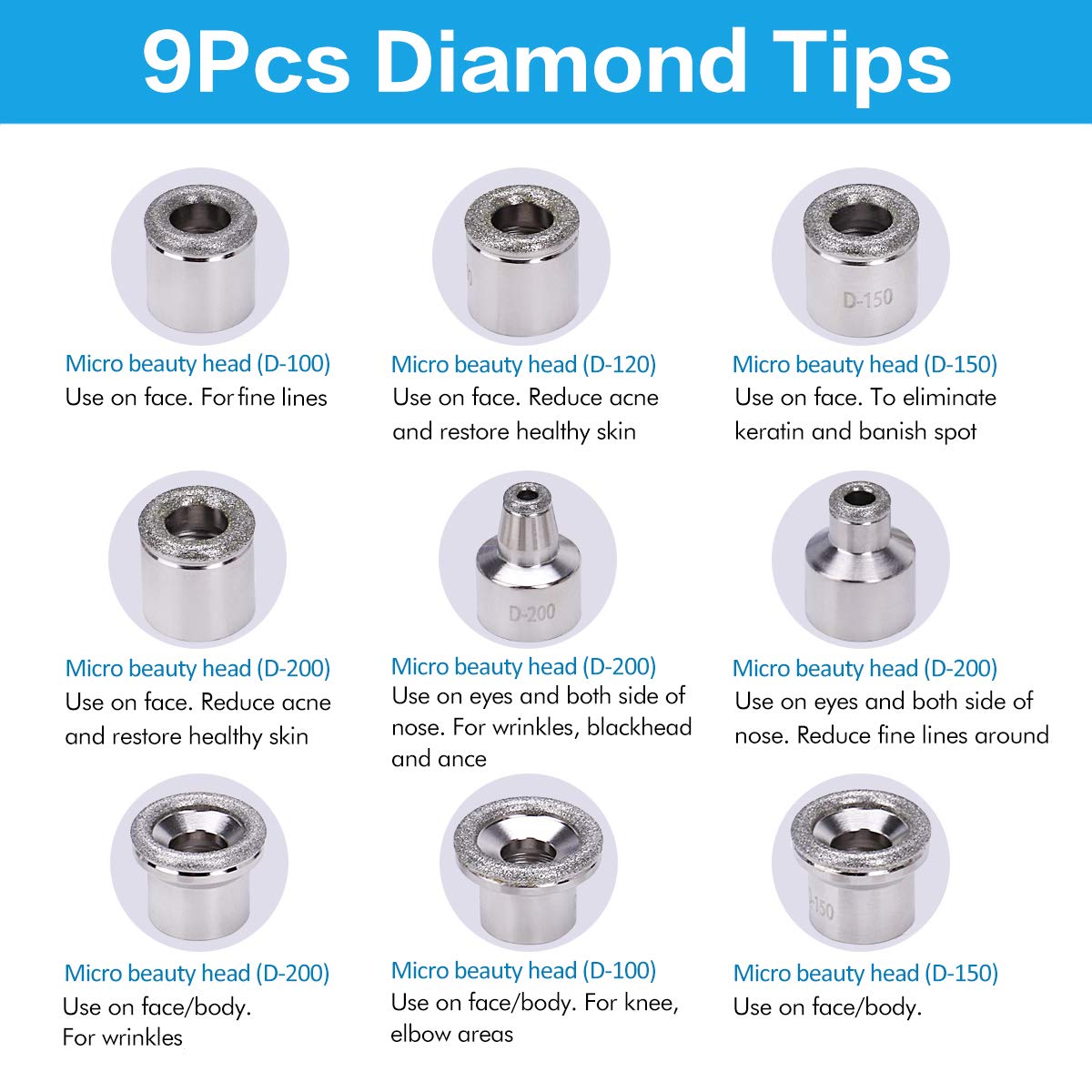 • ?【9 Diamond Head】The microdermabrasion machine is equipped with 9 shaped diamond head of different functions,it has adjustable vacuum intensity to adapt to different area treatment. It suits for face, forehead, chest, nose, neck, near eye area, and detachable bracket for convenient arrangement of diamond heads and wands. ★★Notice: Please start from the lowerest setting, then enhance vacuum bit by bit