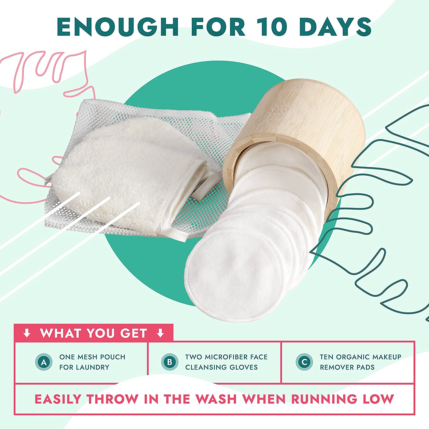• ECO-FRIENDLY & WASTE FREE: Replace your wasteful makeup wipes for good! Our organic makeup remover pads and cleansing gloves can be washed and reused hundreds of times, saving you money and reducing landfill waste. Our product replaces 10,000 disposable cotton balls! Even our packaging is plastic-free and can be recycled.