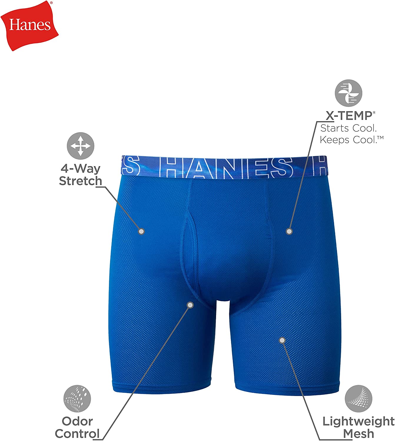 This men's boxer briefs multipack is made from a high-quality X-Temp™ 4-way stretch mesh fabric that's designed to adapt to your body temperature. So as your body sweats, the smart technology wicks away moisture and reduces odor to keep you feeling comfortable all day long. Our experts also designed them with a Comfort Flex® waistband that helps your men's underwear flex and move with you. And their no-ride-up design stays securely in place, so you don't have to keep adjusting throughout the day. Plus, you can throw them right in the washer when they need a quick refresh. And our favorite feature part of all? These men's boxer underwear sets are available in multiple size options that won't ride up, so you can choose the one that works best for you.