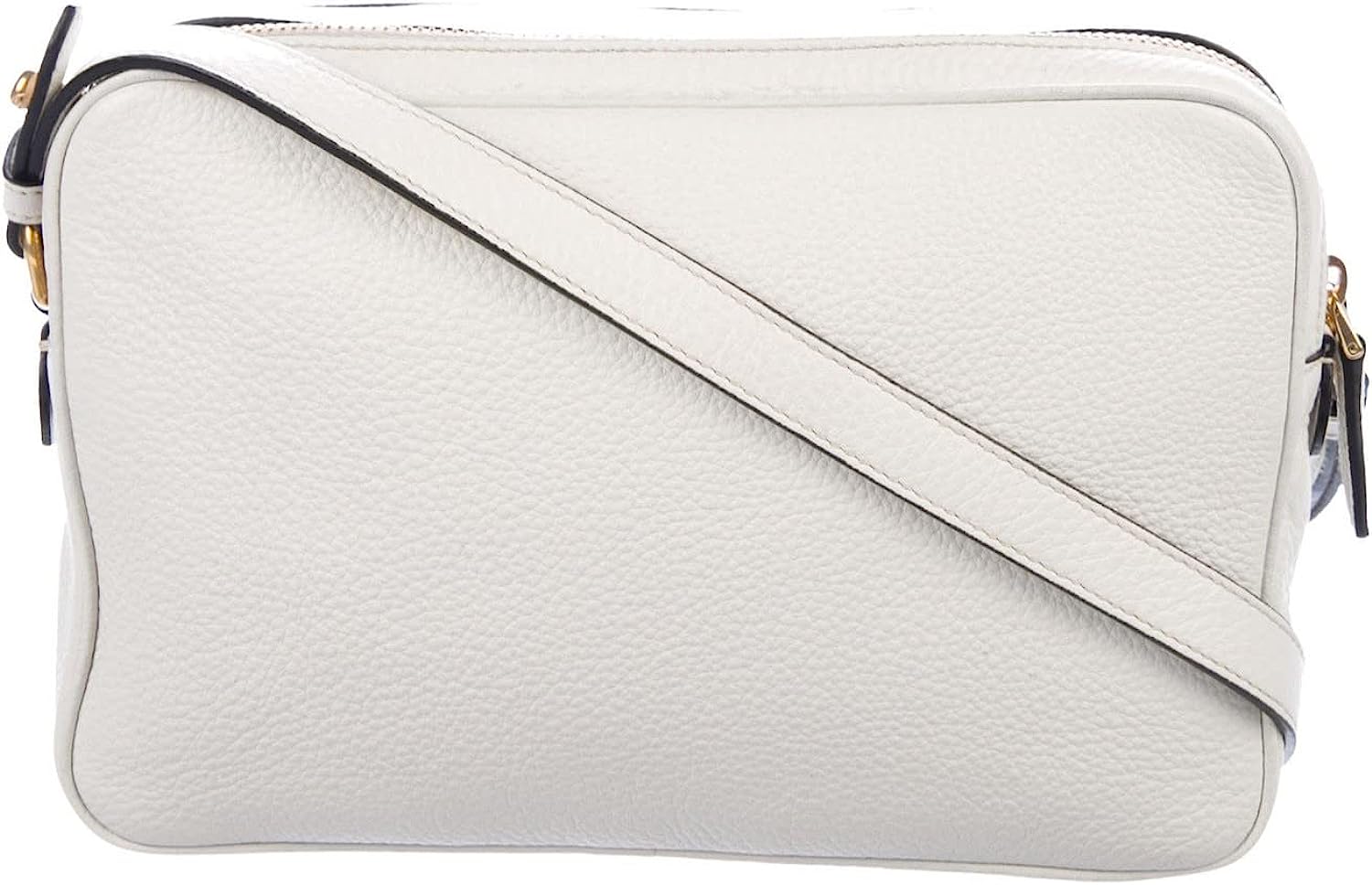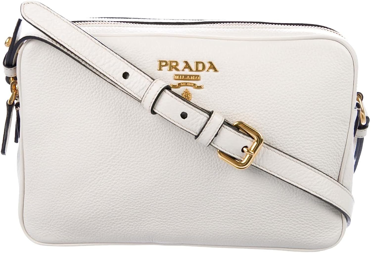 • The two zipper compartments are great for storage and organizing your personal belongings. The gold toned hardware and Prada Milano logo goes beautifully with this white Prada handbag. Model: 1BH079 Material: Vitello phenix leather Color: Bianco white