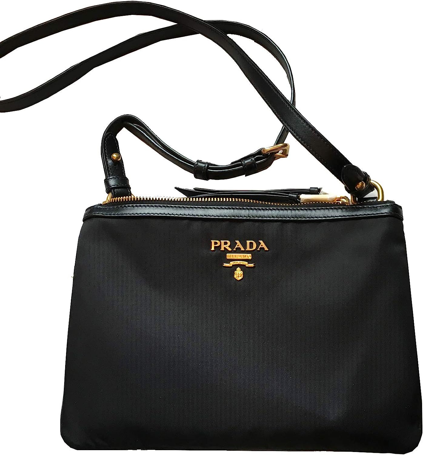 Prada Bandoliera Tessuto Nylon Soft Calf Trim Black Crossbody Bag 1BH046