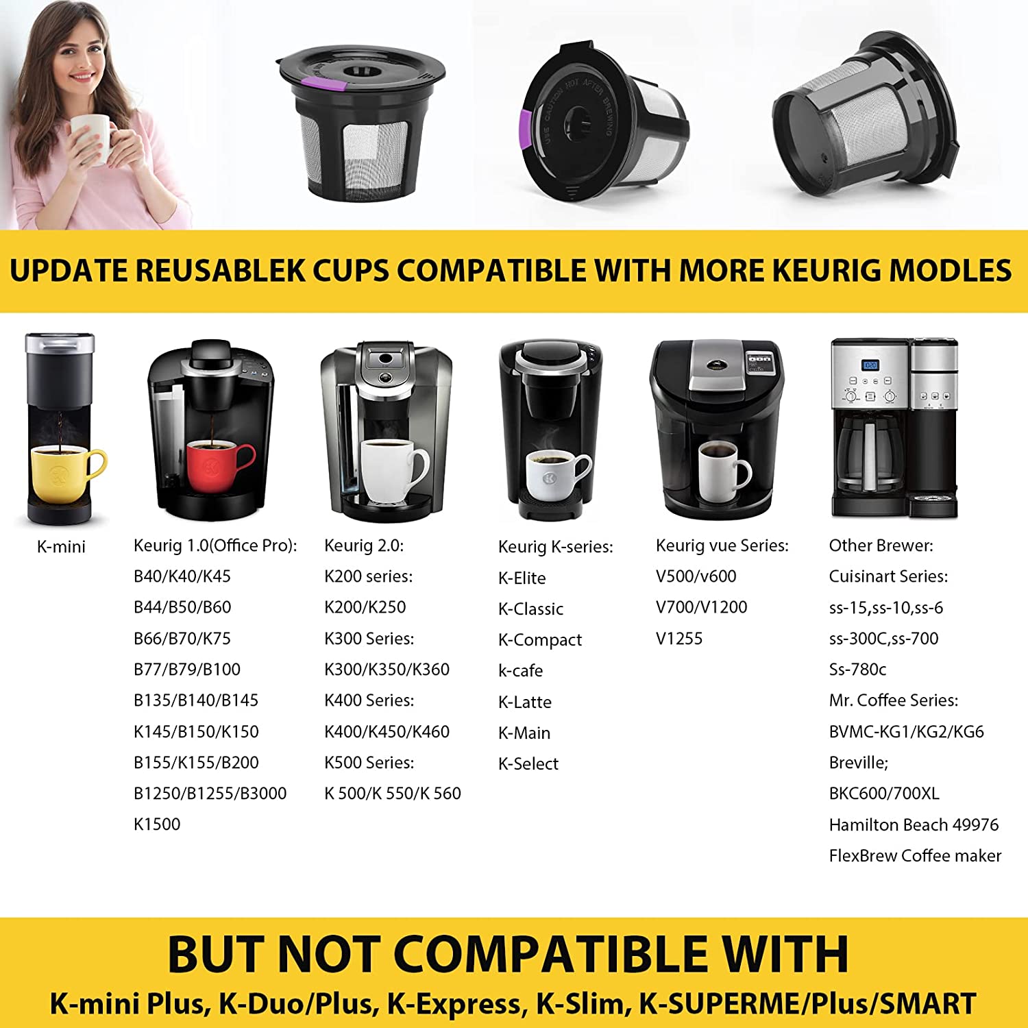 ★[NEWEST CUP LID DESIGN, Vast Compatibility for Keurig 2.0 and 1.0]: K200, K250, K300, K350, K360, K400, K450, K460, K500, K550, K560, K15, K31, K40, K44, K45, K50, K60, K66, K70, K77, K80, K100, B31, B40, B44, B50, B60, B66, B70, B77, B100, B140, B200, As Well As The Following Brewers: K-mini, Keurig Elite, Keurig Select, Keurig Ultimate, Keurig Platinum. Breville K CUP. But NOT Compatible with: K-mini plus, K-Duo/plus, Keurig K-Supreme/Plus/Smart, K-Slim