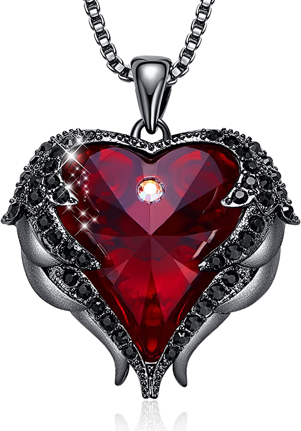 ❤DESIGN❤ Dark Red heart Crystal wrapped in the angel wing base on which there are many small zircons inlaid. Through such a combination of crystals and zircons, The whole necklace presents the shape of the angel heart.