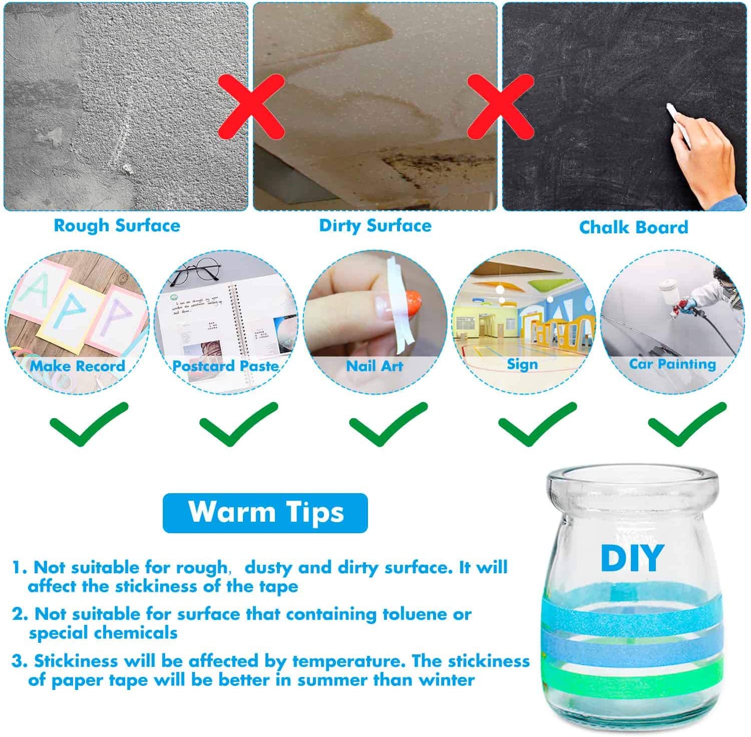 1: Not Suitable for Rough,Dusty and Dirty Surface, It Will Affect the Stickiness of the Tape
