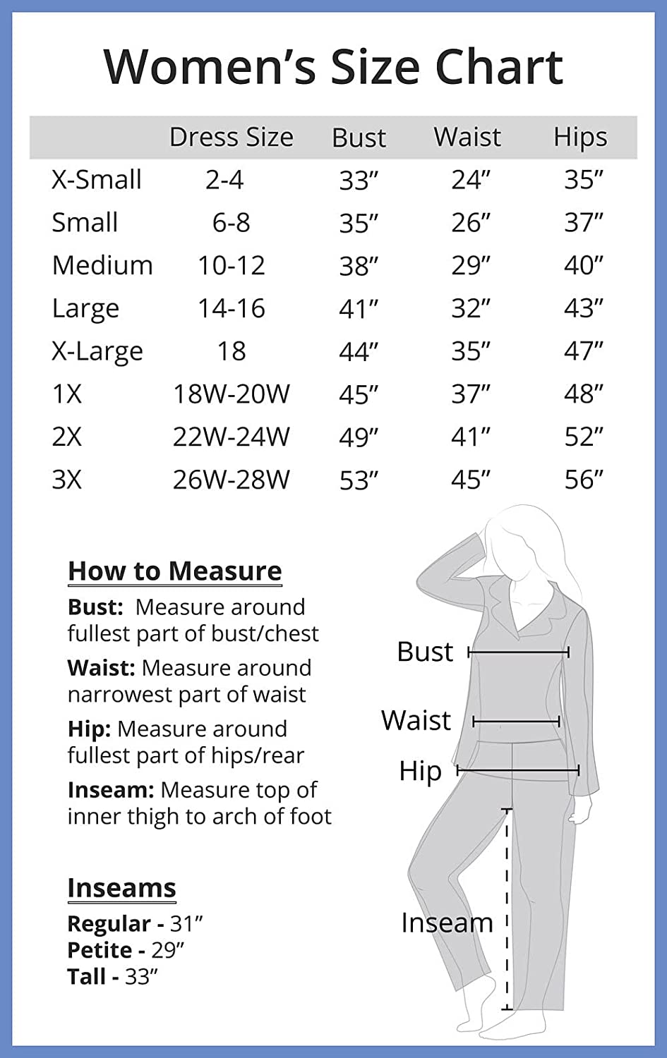 • Find the Perfect Size - Our pajamas for women have been designed by sleepwear experts to fit a range of bodies; below you will find a size chart to help you find your perfect fit.