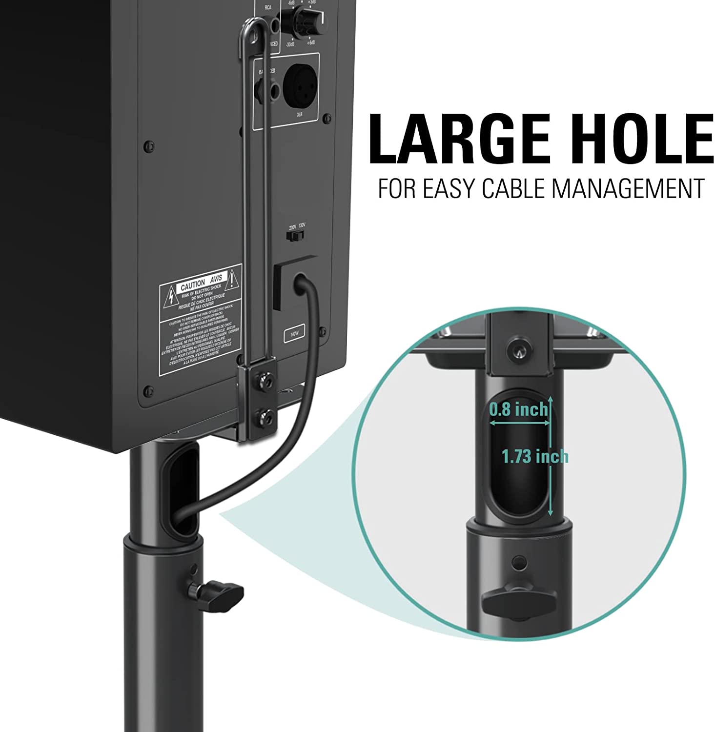 WIRE MANAGEMENT - With concealed wire path, this floor speaker stand is designed with cable hole( 0.8“ W x 1.73" H), which keeps potentially messy cords clean and organized. The enlarged hole design also makes wire management much easier.