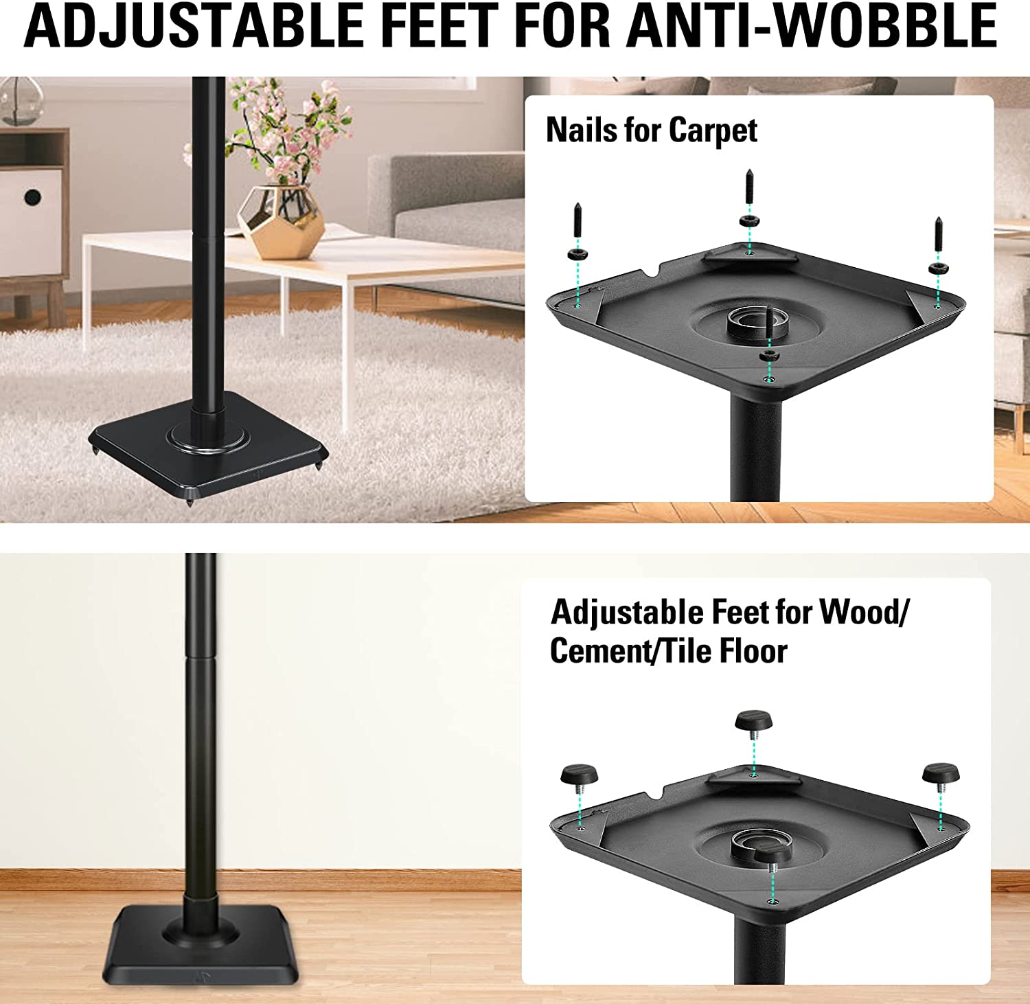 STABILITY & SAFETY - 9.8" x 9.8" wide base ensure your speaker to stand in a way more stable and balanced. Come with adjustable plastic feet and carpet nails for different floor type such as wood, cement, tile floor and carpet. Adjust the feet to level the base for better stability