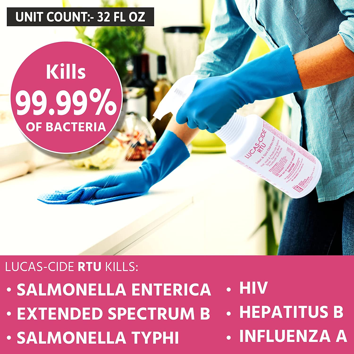 EASY TO USE: Mix 1/2 ounce of LUCAS-CIDE with one gallon of water. Use it at the end of the day on major surfaces such as counters, floors, restrooms, staff kitchens, break rooms as well as on the equipment.