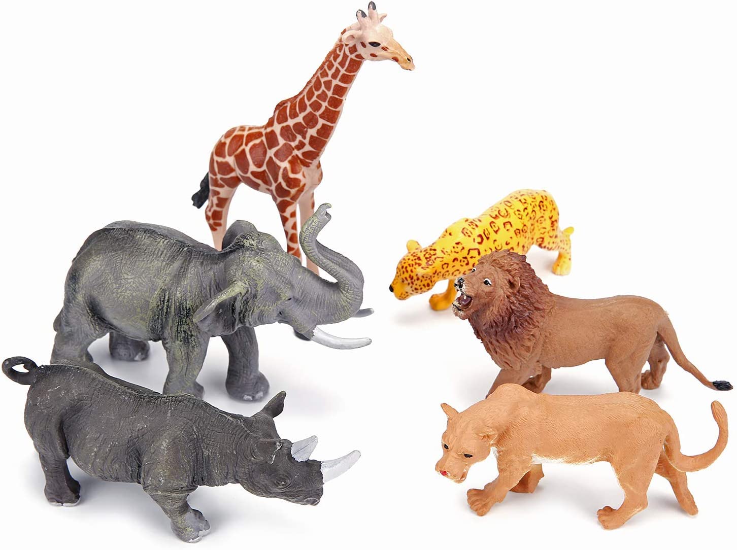 - ? SAFARI ANIMALS: 12PCS unique non-repeating plastic jungle animals with vibrant colors, measure about 5 to 6.3 inch in length. Including tiger, lion, lioness, gorilla, elephant, panda, giraffe, cheetah, rhino/rhinoceros, camel, elk, hippo.
