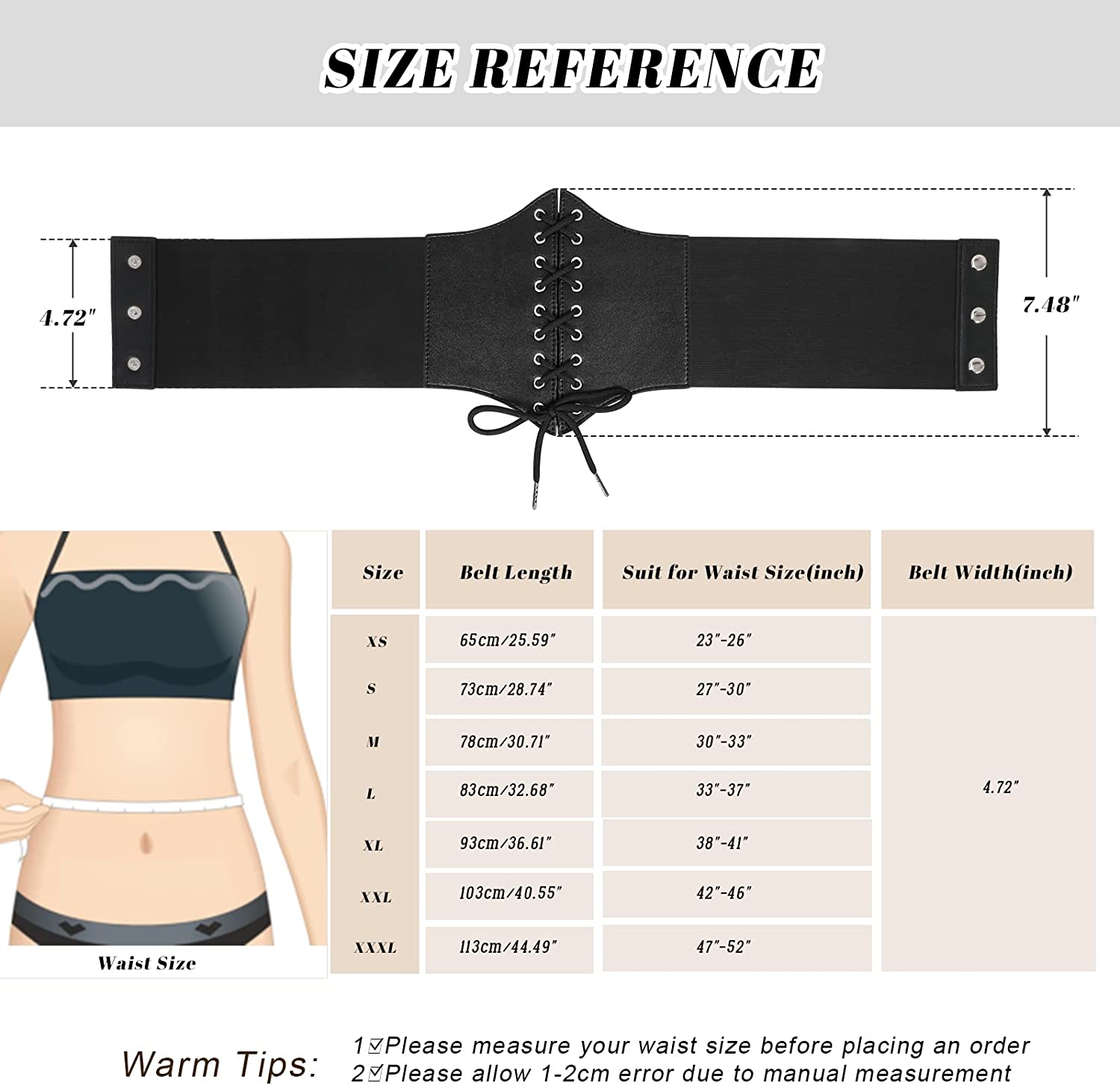 • ☘ SIZE & COLOR –7.48" wide. 7 sizes available. Suitable for waist size from 23”up to 52”. Please refer to our size chart for the desired comfort. Black,brown,red,coffee,white,navy blue and rose red,7 colors to choose, to best meet your taste.