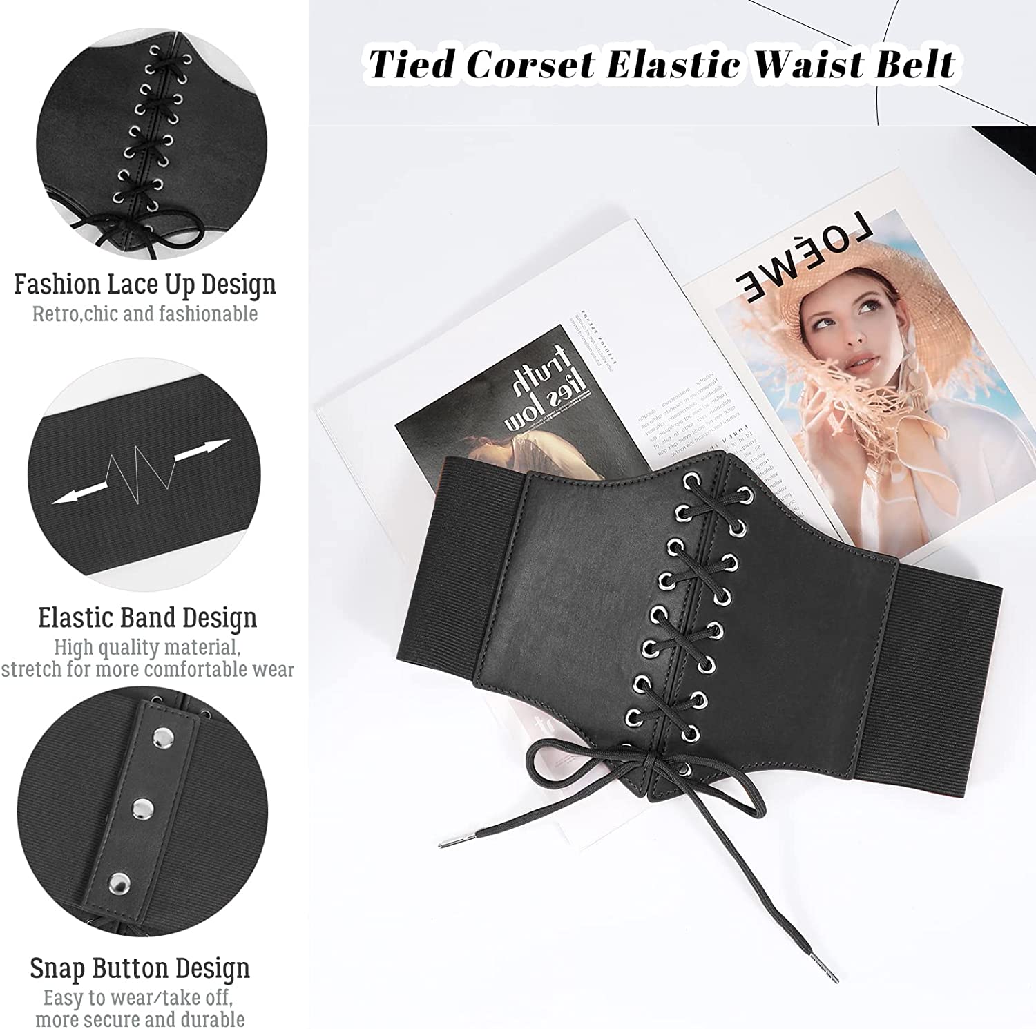 • ☘ CLASSIC DESIGN– Classic vintage style leather lace-up tied waspie corset belt,high quality PU leather front sewed with well elastic wide band, fastened by 3 snap buttons, which is easy to put on and remove. This waspie corset belt is super comfortable to wear. Flatters your waist. The 7.6" width prevents dress belt from rolling up or rolling down in wearing.